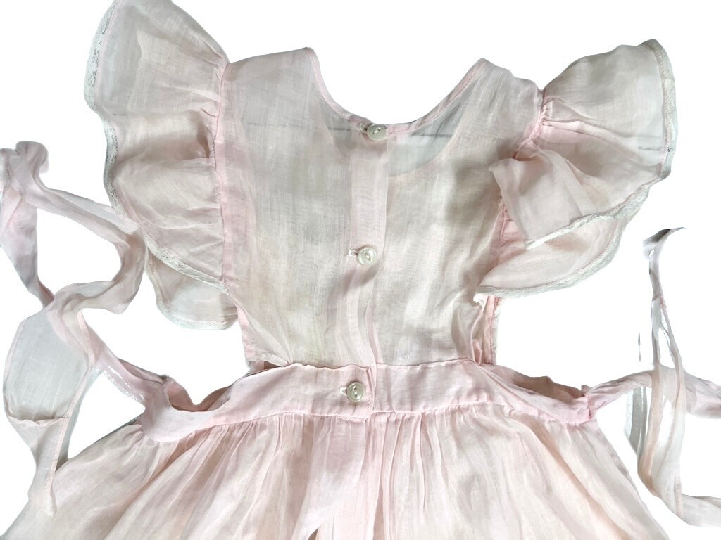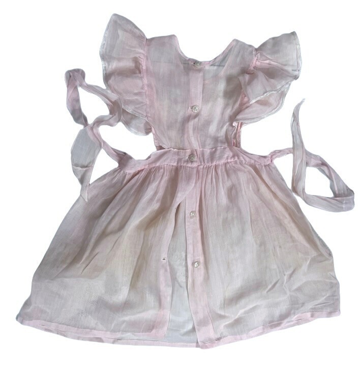 Adorable vintage girls? pinafore dress in sheer pink organdy, marked size 4. Features an open-sided pinafore design, full skirt, and delicate tailoring that captures the charm of mid-century children?s fashion.