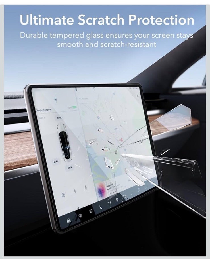 The Glass Screen Protector for Tesla Model 3/Y is a high-quality, 9H tempered glass protector specifically designed for Tesla vehicles. It features anti-glare technology, as well as being anti-shatter, anti-fingerprint, and anti-scratch. This clear protector is easy to install and comes with a protective skin included. With a manufacturer warranty of 1 year, this unit is a reliable choice to keep your Tesla's screen in pristine condition. Made by ESR in the United States, this transparent protector is a must-have accessory for Tesla Model 3 and Y owners.