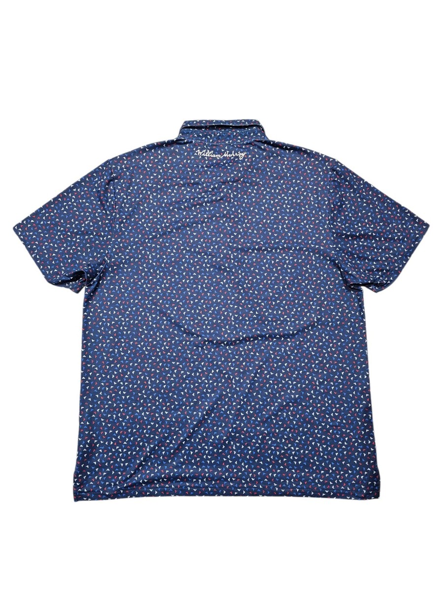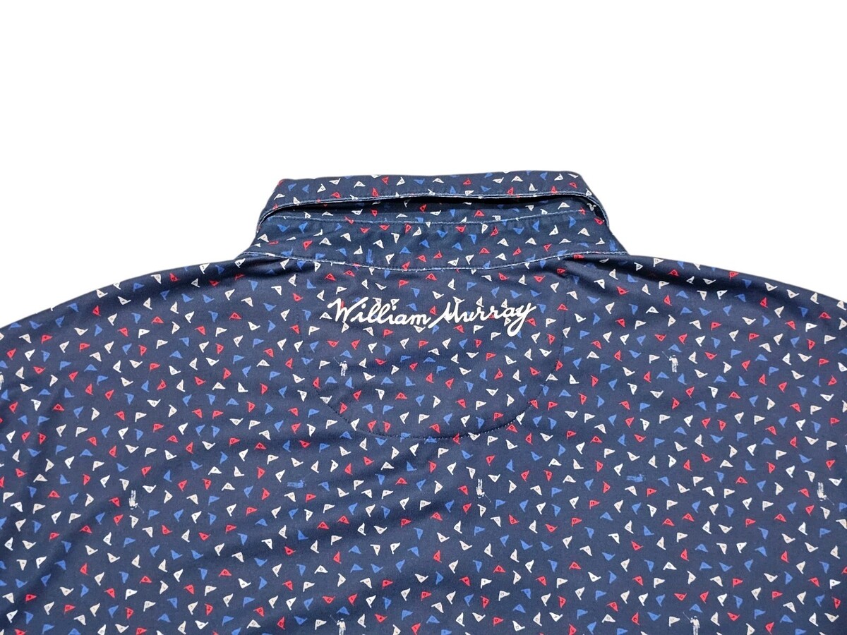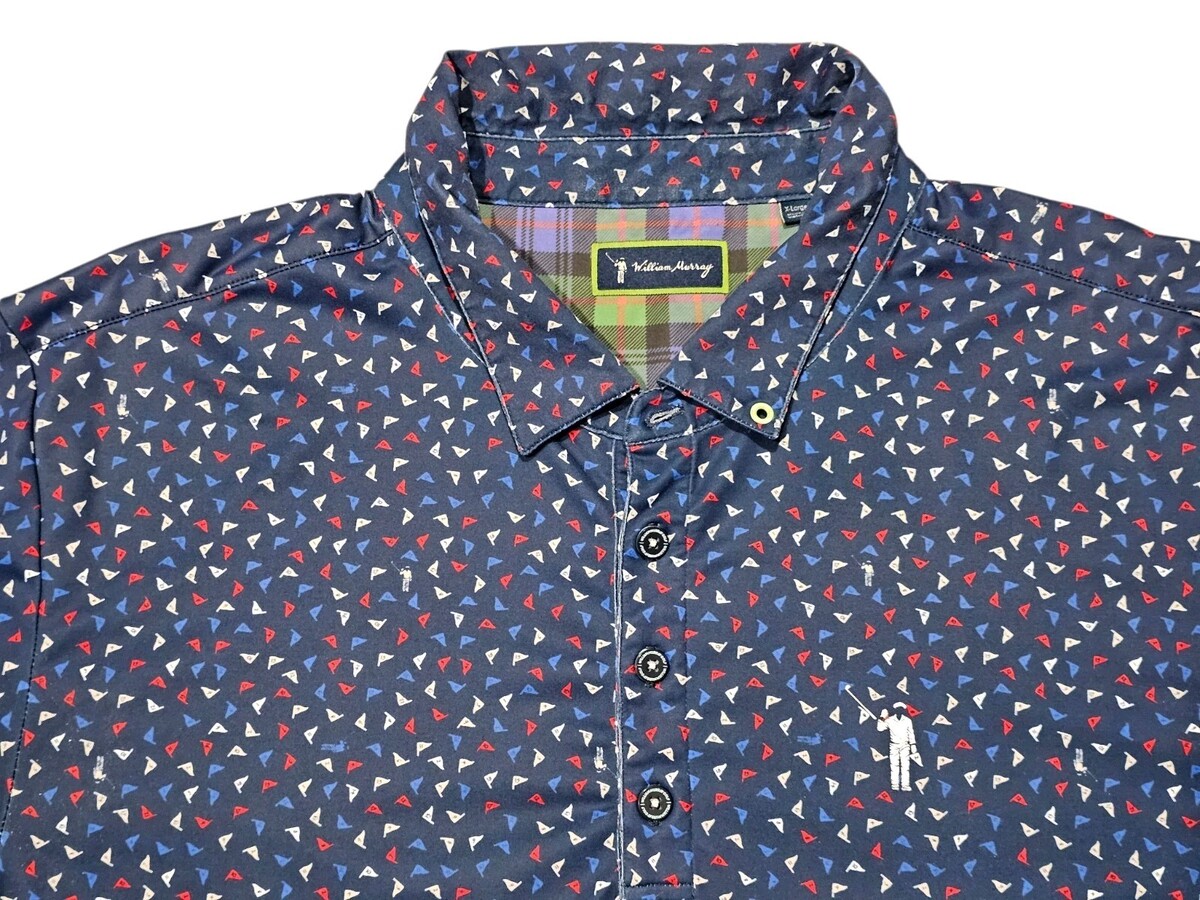 The William Murray Men's Polo in size XL is a stylish golf shirt in blue with an allover golf flag cubbies design, perfect for active occasions such as travel, casual outings, or business events. Made of polyester and spandex microfiber fabric, this spread collar polo features a button closure and easy-care, non-iron properties. The classic navy blue color and geometric pattern add a fun and sporty touch, making it ideal for outdoor activities like golfing. The regular fit and XL size ensure comfort and style for men looking for a unique and high-quality polo shirt.