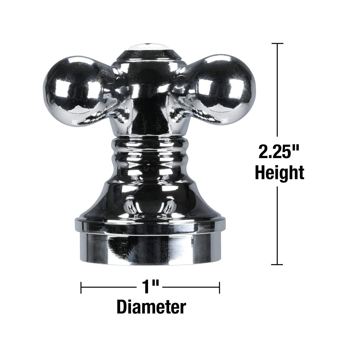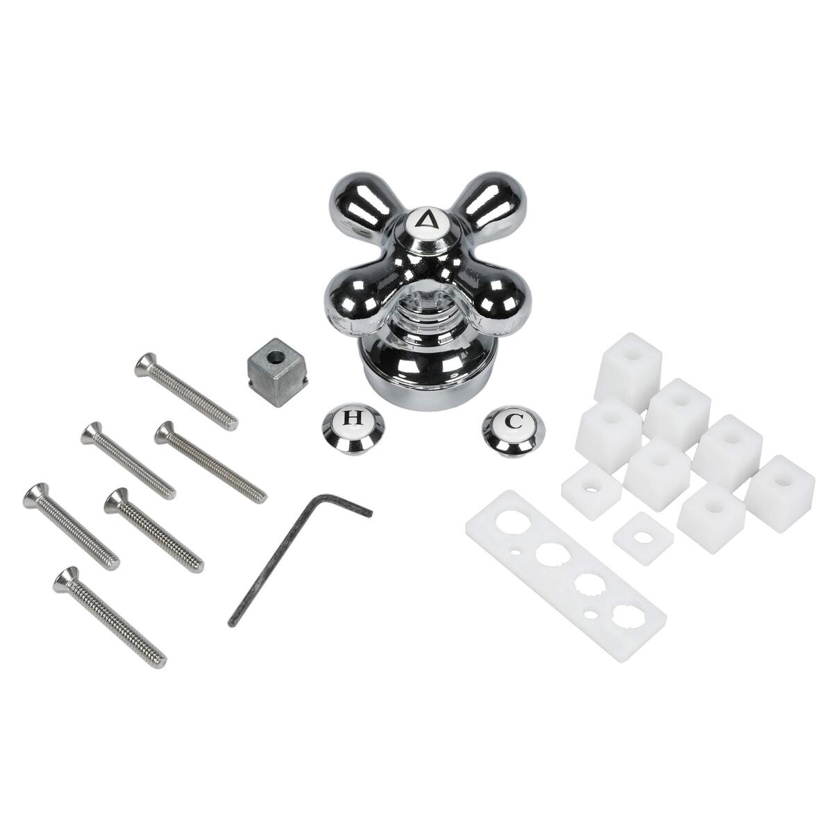 This Danco chrome cross-arm faucet handle kit includes everything needed for a convenient DIY installation. The versatile transitional design replaces worn out faucet handles and fits most standard 2-handle faucets with a 3-inch projection distance. Made from zinc alloy with a polished chrome finish, this single handle measures 3 inches in diameter and has an overall height of 2-1/4 inches. It comes with 7 plastic adapters and 1 metal adapter to accommodate a variety of faucet brands and models. The cross-arm handle has a top-mount set screw and optional spacers to prevent damage during installation. With the included gauge, Allen wrench, and tools, you can easily attach the handle and hot/cold buttons. This complete kit contains everything needed for a smooth and stress-free DIY faucet repair or replacement. The chrome finish provides a modern, farmhouse look that will update your bathroom decor.