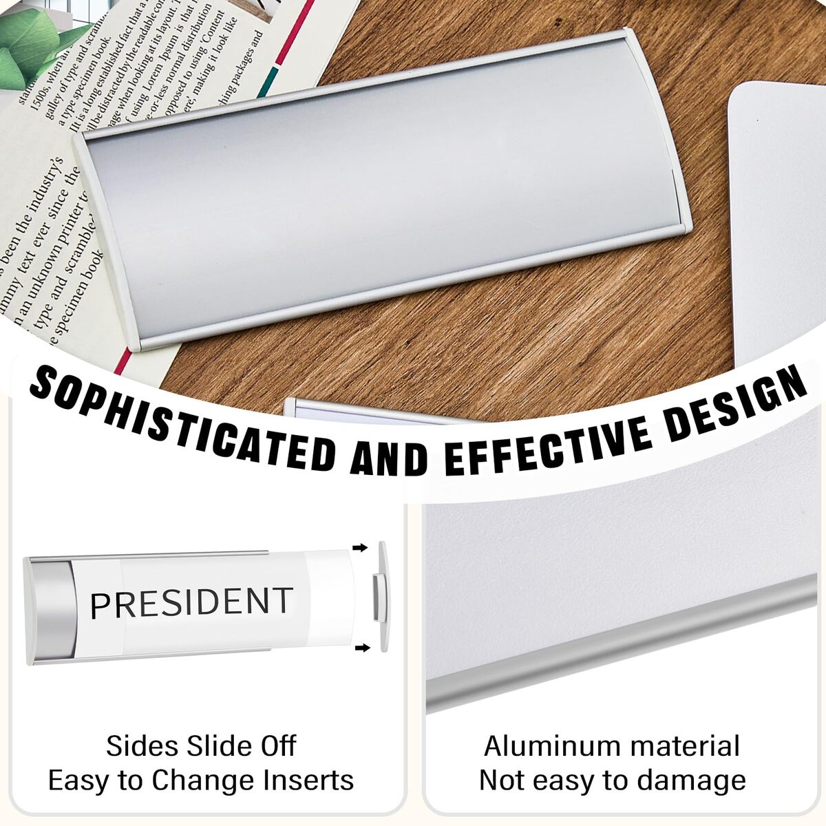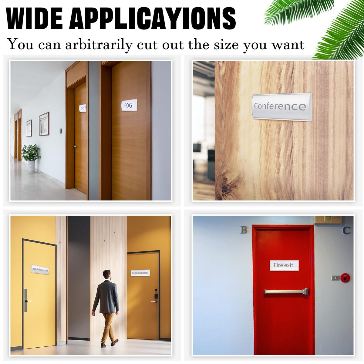 Sufficient Quantity and Suitable Size: the package includes 12 pieces of name plates for doors, which provides enough quantity for offices or institutions; Each nameplate measures approximately 3 x 8 inches/ 8 x 21 cm and includes plastic film, paper insert not included; Large enough to be easily noticed,Quality Material: each office door name plate is made of quality aluminum material which adds an elegant, professional and exquisite look to many office environments; The silver color offers a sleek and modern aesthetic, adding a touch of class to many types of spaces,Not Easy to Drop: the name plate for wall come with a non marking tape that keeps it securely attached to many surfaces; Don't worry about this name tag falling; It sticks reliably and are suitable for many offices,Easy to apply: the door name plat is designed for easy application; The aluminum material is reliable and lightweight, and the anon marking tape ensures easy installation; You only need to peel and stick, which will not broke the door, can be drilled for installation if necessary,Wide Applications: these office name plates for wall are not just for office doors, and they can be applied in a variety of ways; They are suited for cubicles, office desks, meeting rooms, reception areas, and other places where it's essential to display names clearly; They can help you identify wall signs, name titles, office business units, cubicle conference rooms, office areas, room numbers, warning areas