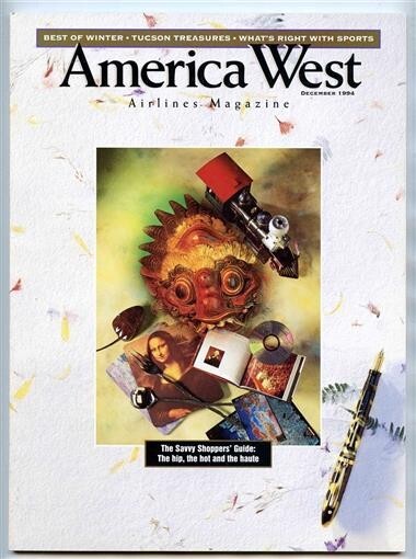 An original America West Airlines in flight magazine in fine condition. This is the 144 page December 1994 America West Airlines Magazine. Savvy Shoppers' Guide; on the cover and feature article. Many photos, stories, articles and more.