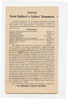 A 4 1/4" x 7" 2 sided card printed on very heavy stock. Indiana State Soldiers and Sailors Monument Specifications Card . Has image of the monument on one side and Dimensions and history on the other side.