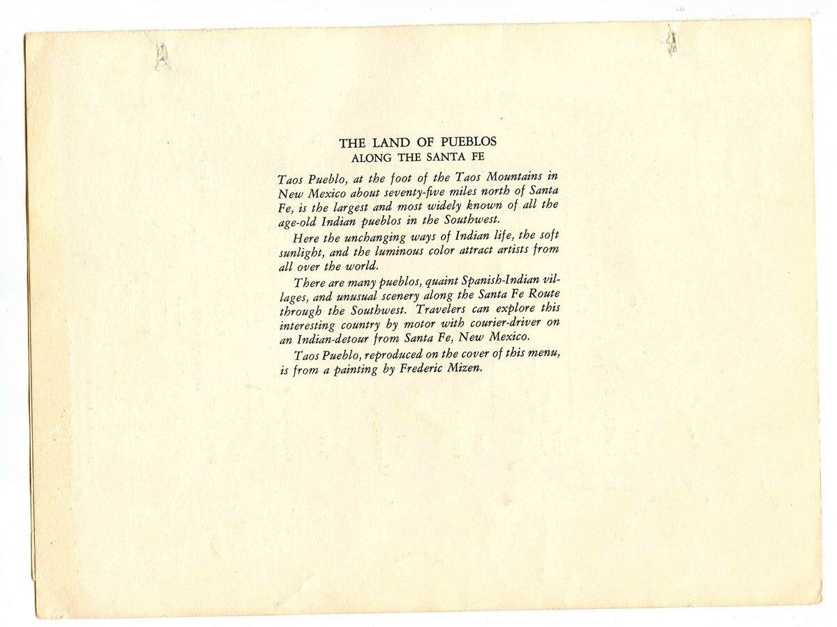 Santa Fe Dining Car Menu Texas Chief Taos Land of the Pueblos Cover Fred Harvey