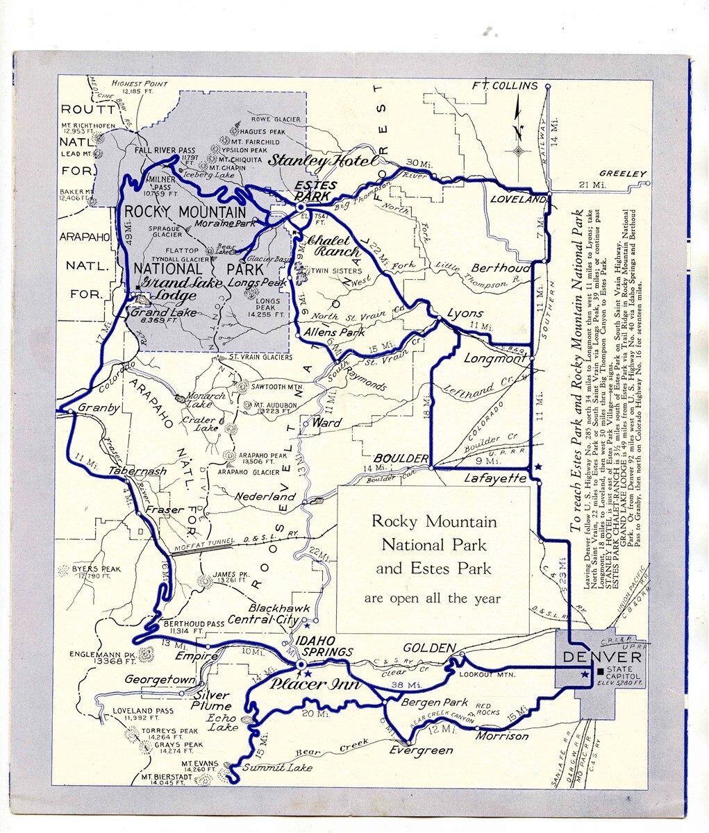 A very well illustrated 12 panel fold out brochure with lots of photos Hotel information, Area Map and More. Rocky Mountain National Park Estes Park Hotels Brochure by the Rocky Mountain Motor Company of Denver Colorado. Includes the Stanley Hotel , The Chalet Ranch, and Grand Lake Lodge. Circa 1930's