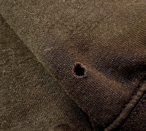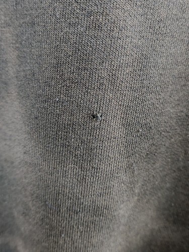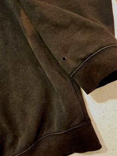 Fading discoloration , pocket and sleeve holes, and pilling to the interior. Still has hood drawstring.