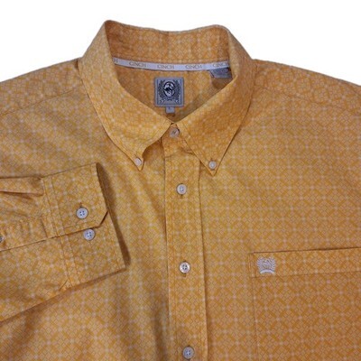 The Cinch Western Shirt is a classic men's button-up shirt in a vibrant yellowish gold color, perfect for casual occasions. Made from lightweight and breathable cotton fabric, this shirt features a collared neckline and long sleeves, ideal for all seasons. The shirt is adorned with embroidered accents and a geometric pattern, adding a touch of Western flair. With a chest size of 50 inches and a regular fit, this shirt is easy to care for and machine washable, making it a versatile and stylish addition to any man's wardrobe.