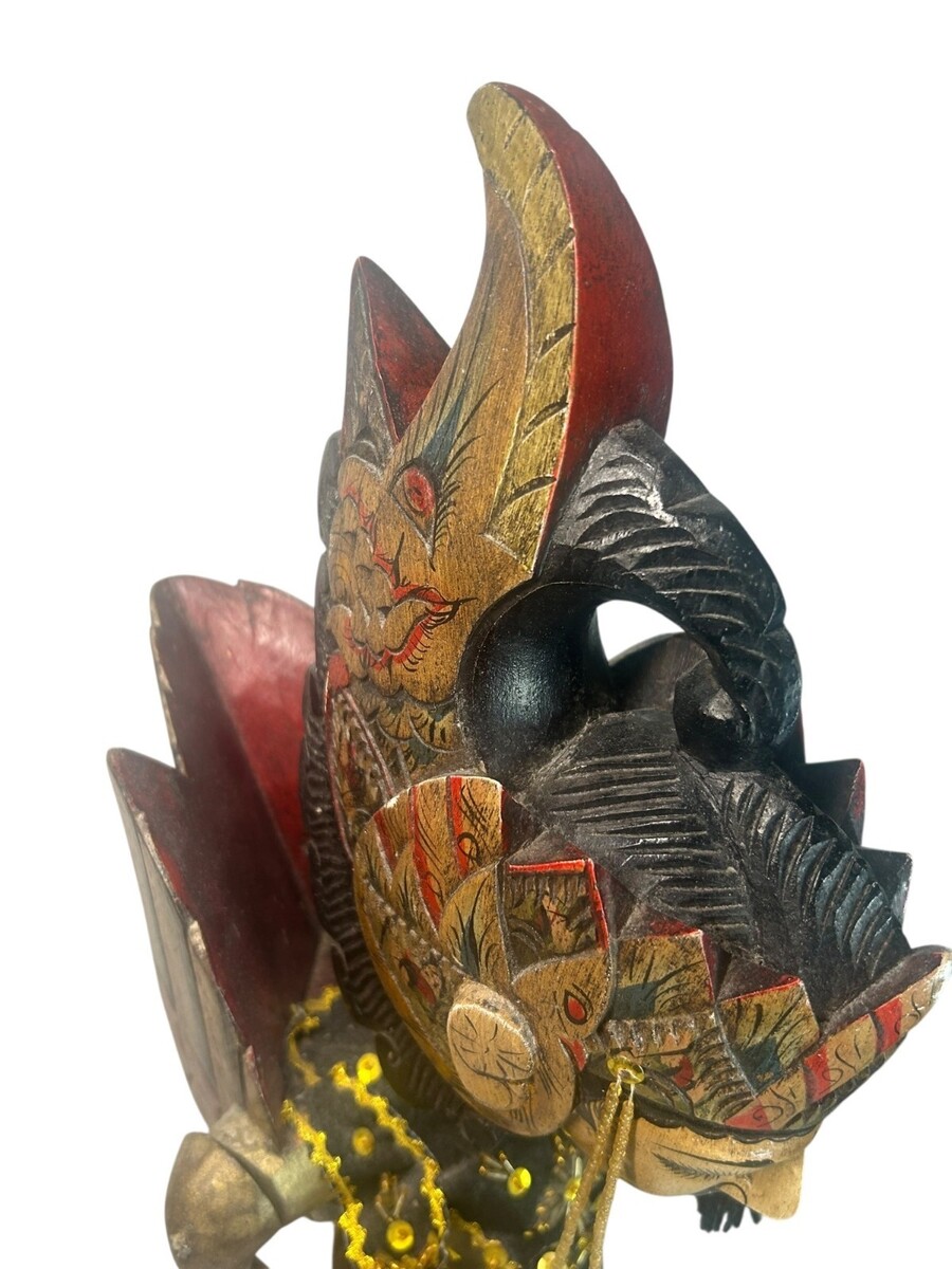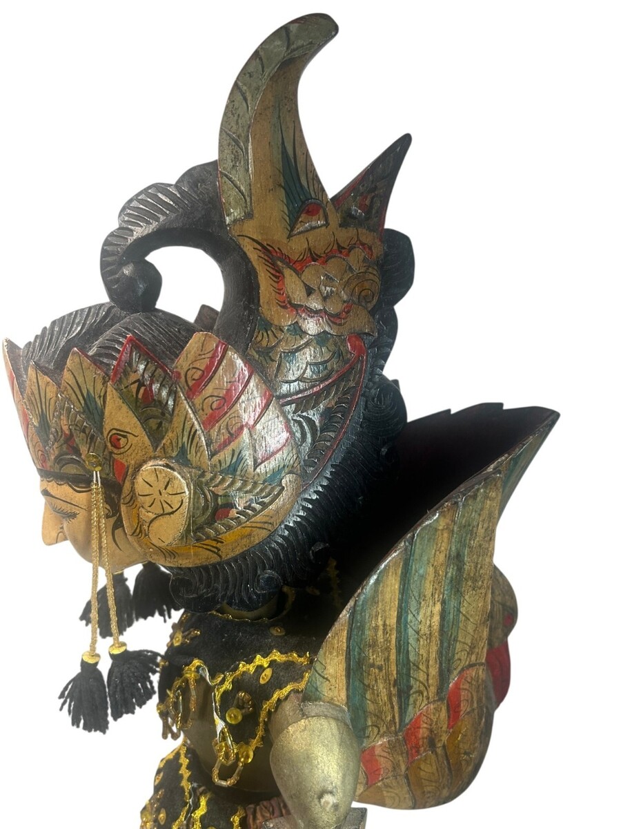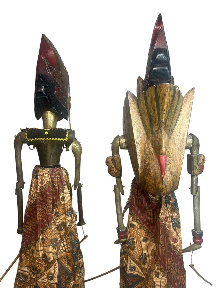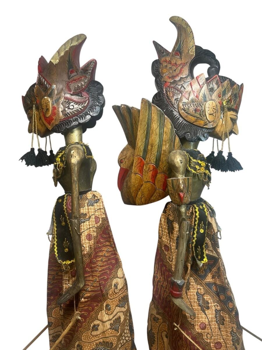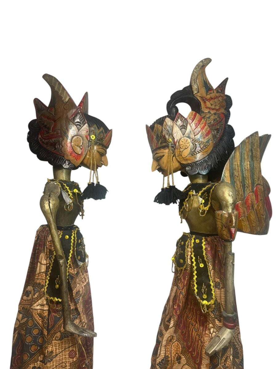 These puppets represent noble characters from the great Hindu epics. Each figure features a hand-carved wooden head with a traditional garuda mungkur (winged headdress) and a refined, hand-painted expression. They come dressed in their original ceremonial attire, including: