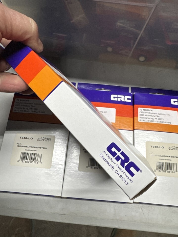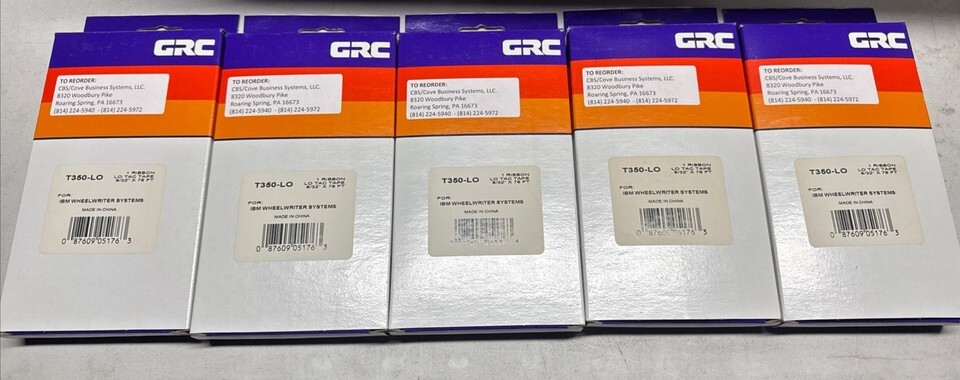 The product is a lot of 5 GRC T350-LO typewriter lift off ribbon designed for use with IBM Wheelwriter typewriters. Manufactured in the United States by GRC, a trusted brand in typewriter supplies, these ribbons are specifically designed for the IBM Wheelwriter series. Perfect for businesses or individuals who rely on typewriters for their daily operations, these lift off ribbons ensure high-quality printing and reliable performance.