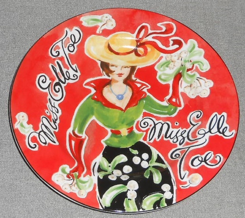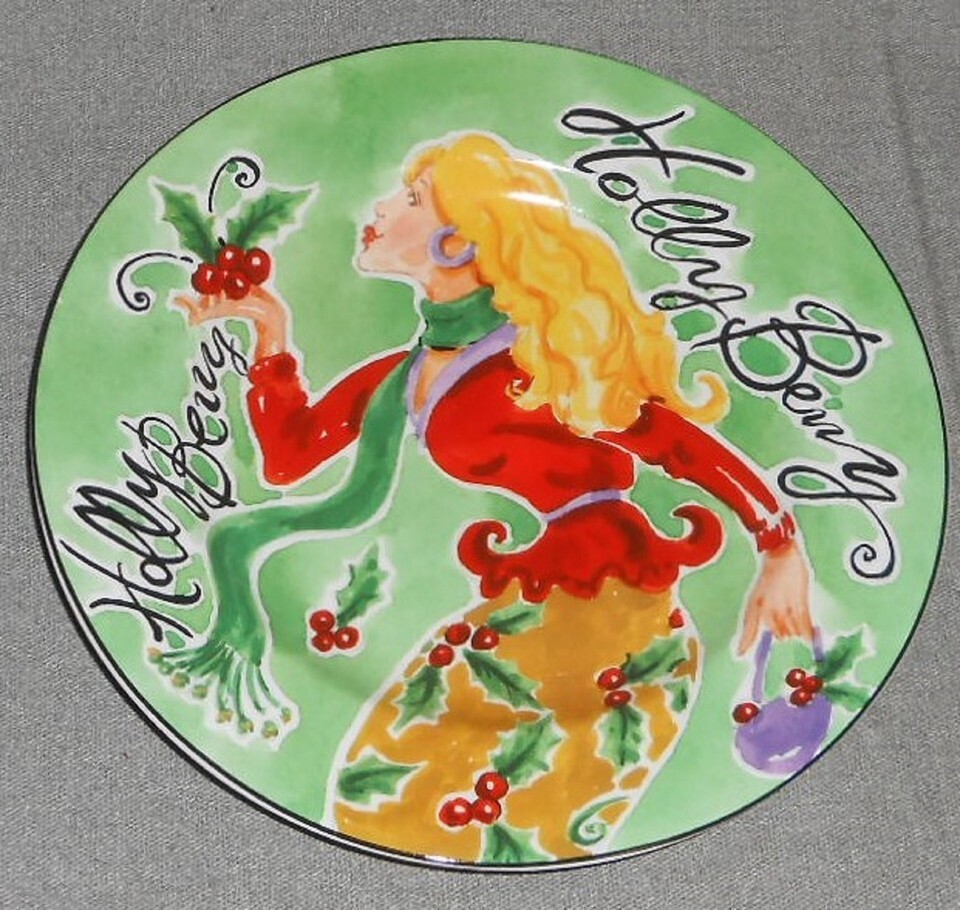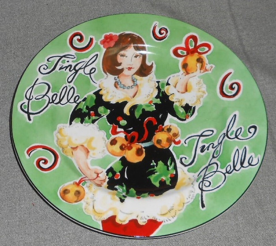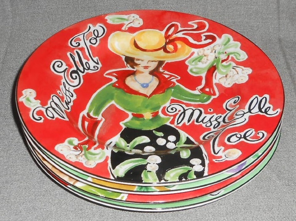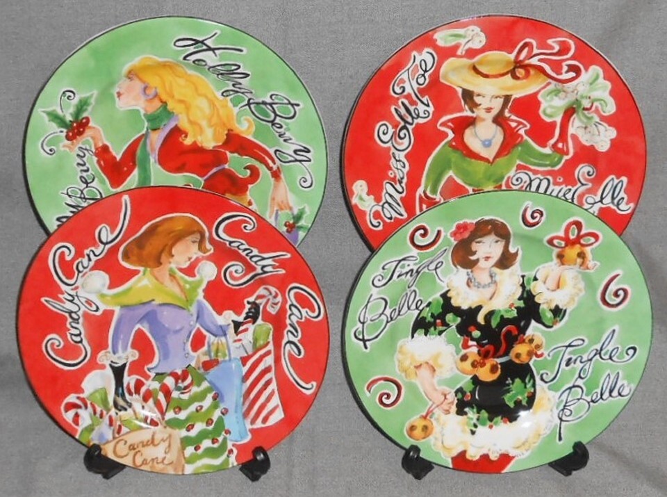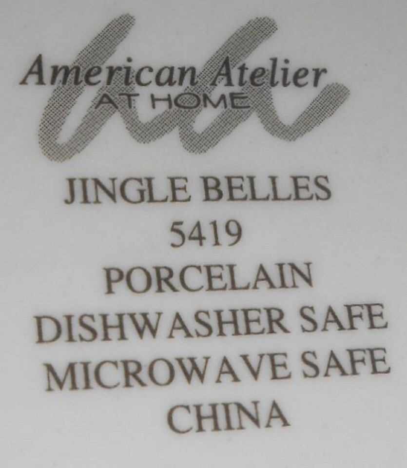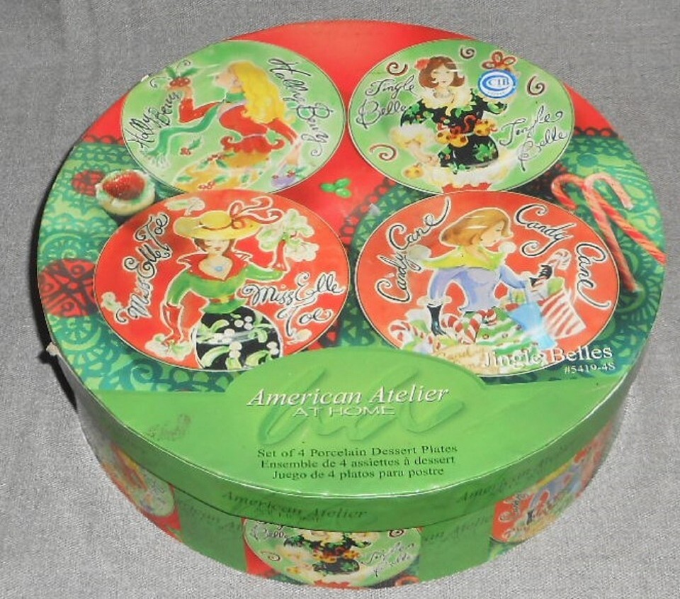 This is a set of (4) 8 1/4" Salad Plates from American Atelier in the colorful Jingle Belles Pattern...GREAT GRAPHICS!!!!. All four are in great pre-owned condition with no chips or damage and come with their original box (box is worn/torn in a few places).