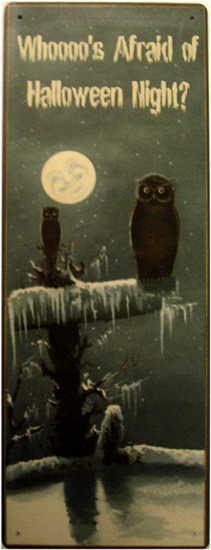 Who's Afraid of Halloween Night Owls Harvest Fall Autumn Pumpkin Metal Sign