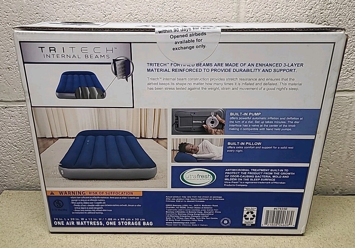 The Bestway 67932E Tritech 12" Twin Air Mattress is a durable and comfortable option for adults seeking a medium-firmness mattress. This inflatable air bed features a built-in pump for easy inflation and a unique antimicrobial feature for cleanliness. The rectangular shape and twin size make it ideal for a standard bed setup, while the 12-inch thickness provides ample support. The blue color adds a pop of color to any bedroom, making it a practical and convenient choice for guests or temporary sleep arrangements.
