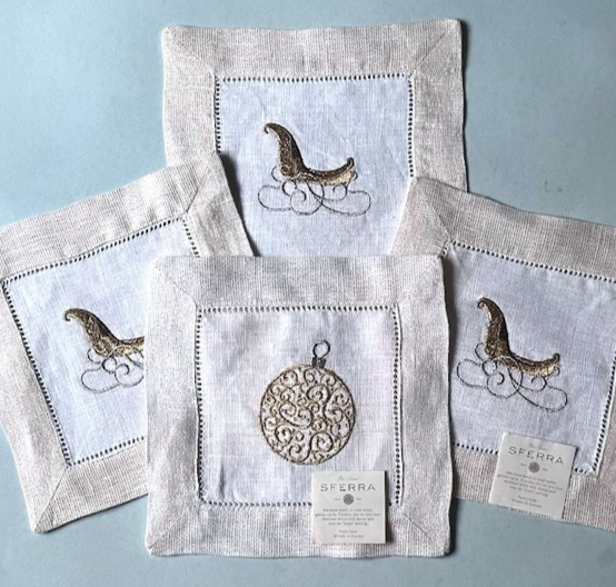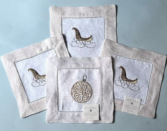 Sferra Embroidered Linen Cocktail Napkins Mixed Sled & Ornament 4 PC. 6x6 New
