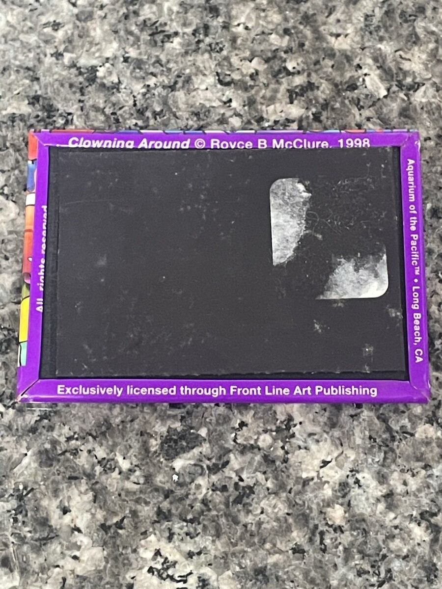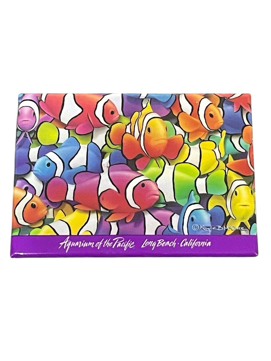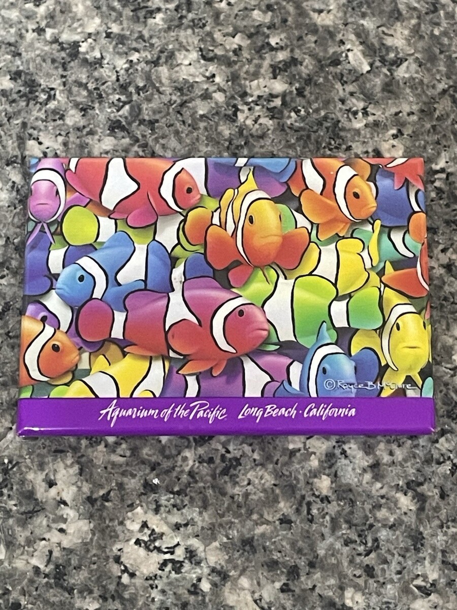 The product is a colorful fish-themed refrigerator magnet featuring the Aquarium of the Pacific in Long Beach, California. The magnet is in a rectangular shape and can be a great addition to any kitchen or home decor. Made of plastic and metal, this glossy magnet is perfect for all occasions and serves as a modern and eye-catching souvenir from the attraction. Ideal for collectors or those who appreciate unique kitchen tools and gadgets, this magnet offers a fun and vibrant touch to any space.