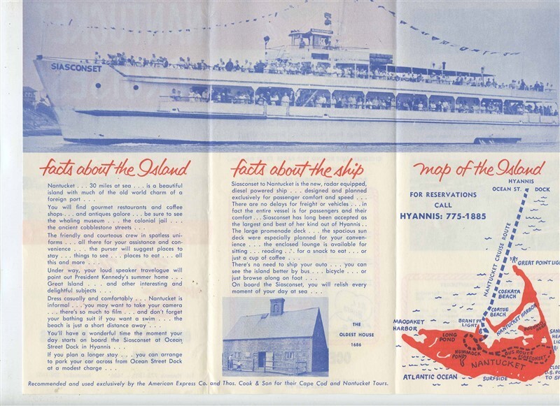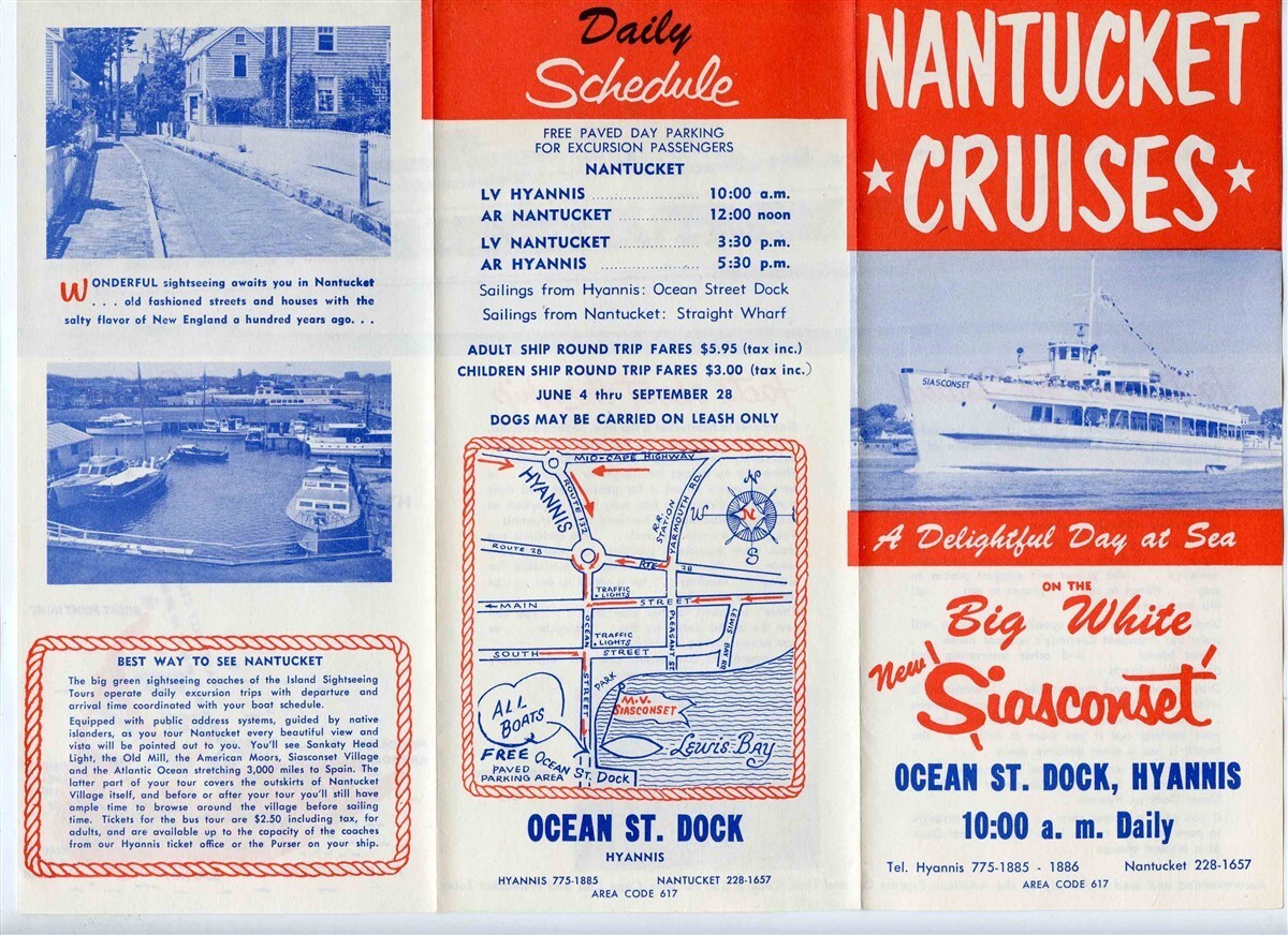 A 6 panel fold out brochure with map, facts about the ship, facts about the Island, ship photos, schedule, fares, area map, port photos and more. Nantucket Cruises Brochure On the Big White Siasconset. , leaving Hyannis Massachusetts to Nantucket.