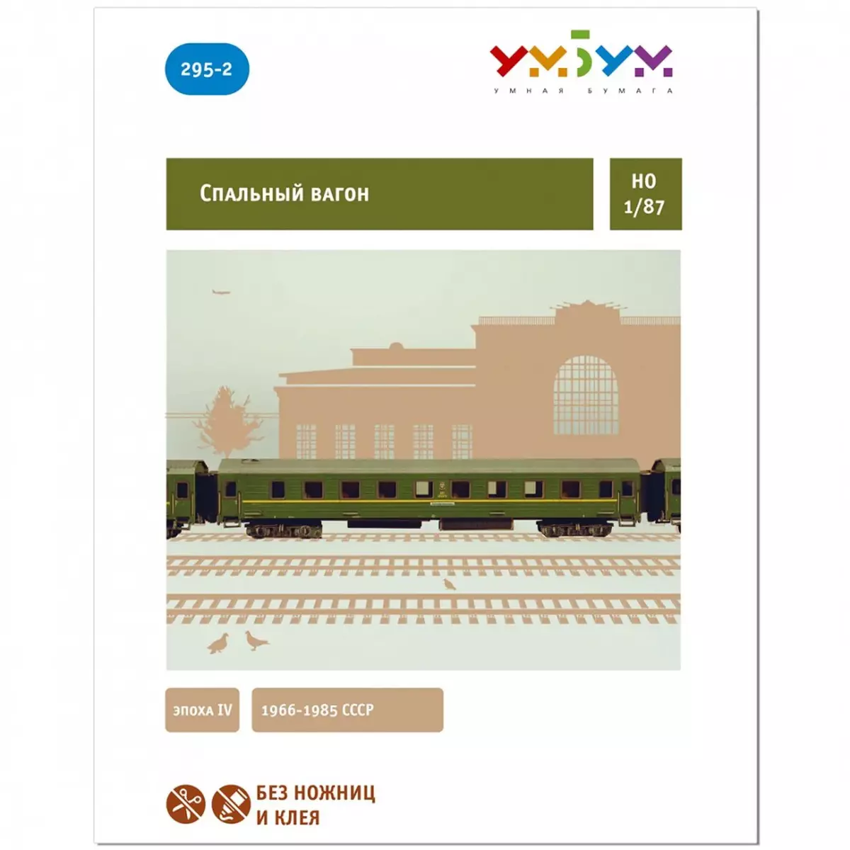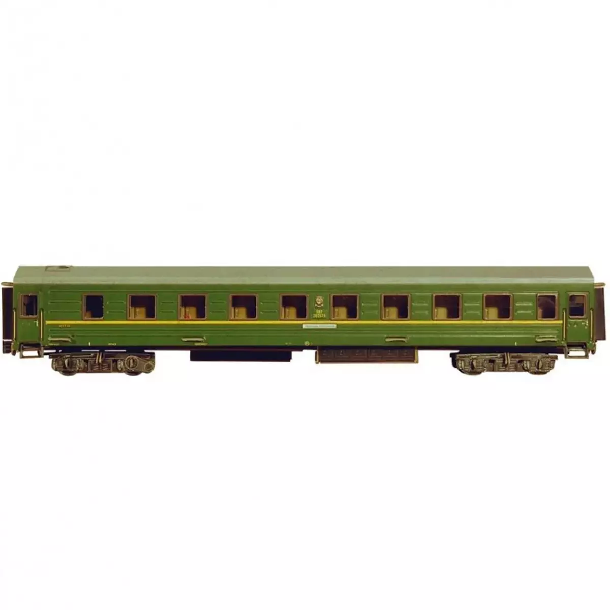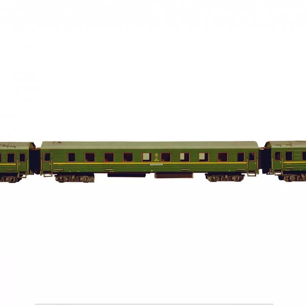 Build a realistic HO (1:87) long-distance sleeping passenger coach in classic green livery. This detailed cardboard model kit includes transparent window inserts and interior compartment details visible through the windows.