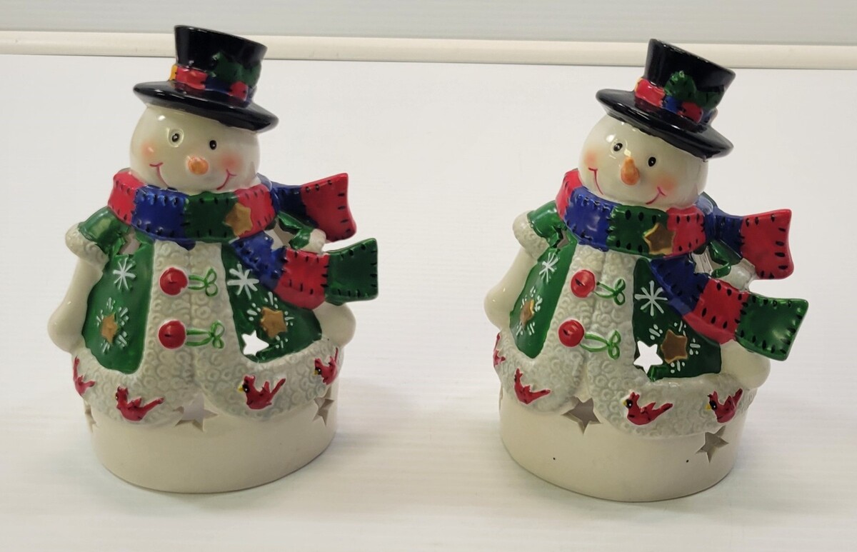 P) Vintage Set of 2 Ceramic Christmas Snowman Tea Light Candle Holders