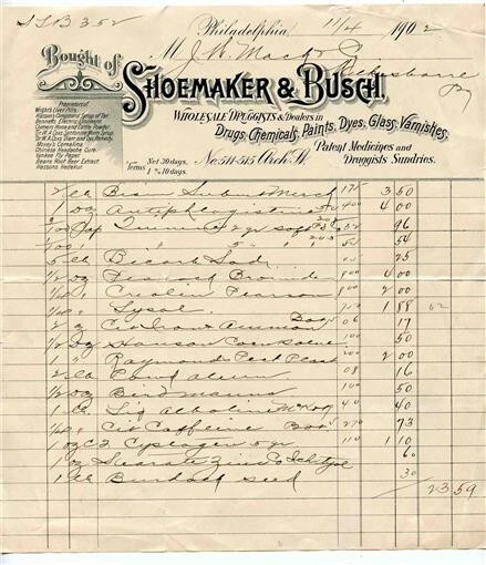 Shoemaker & Busch Wholesale Druggists 1902 Handwritten Invoice Philadelphia PA