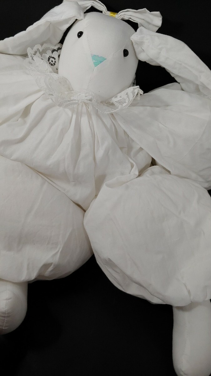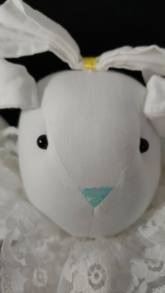 Plush white fabric bunny rabbit decor green nose lace collar vintage Hong Kong
