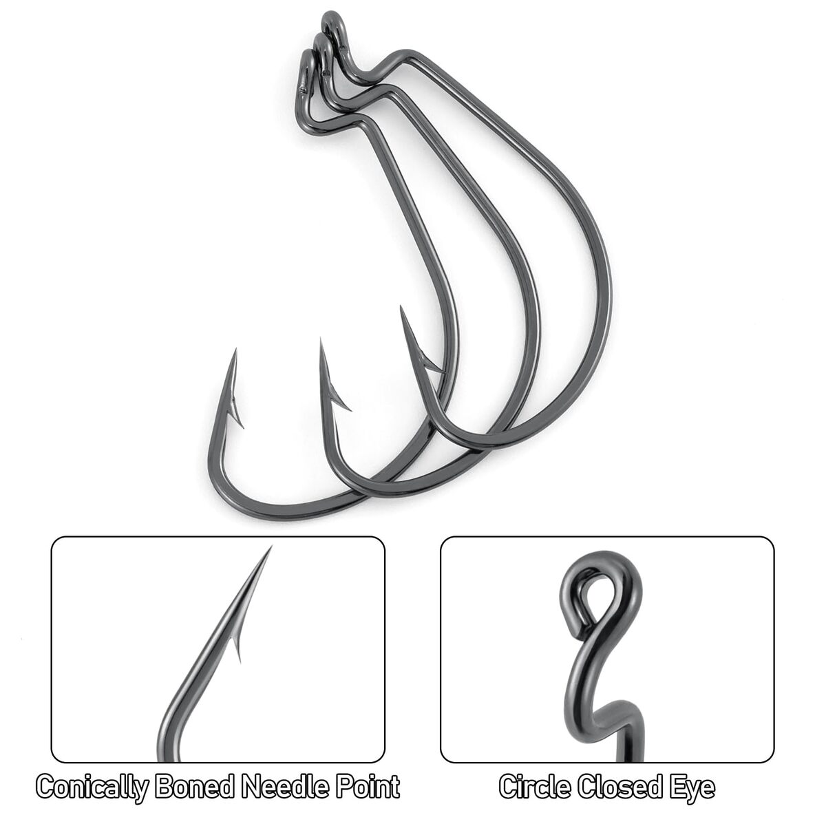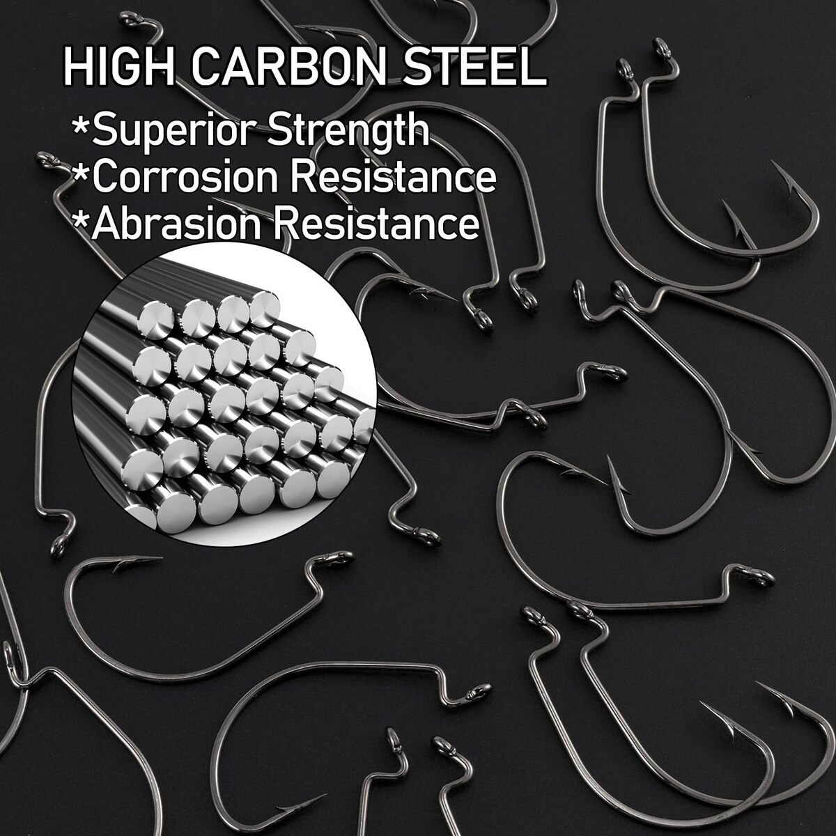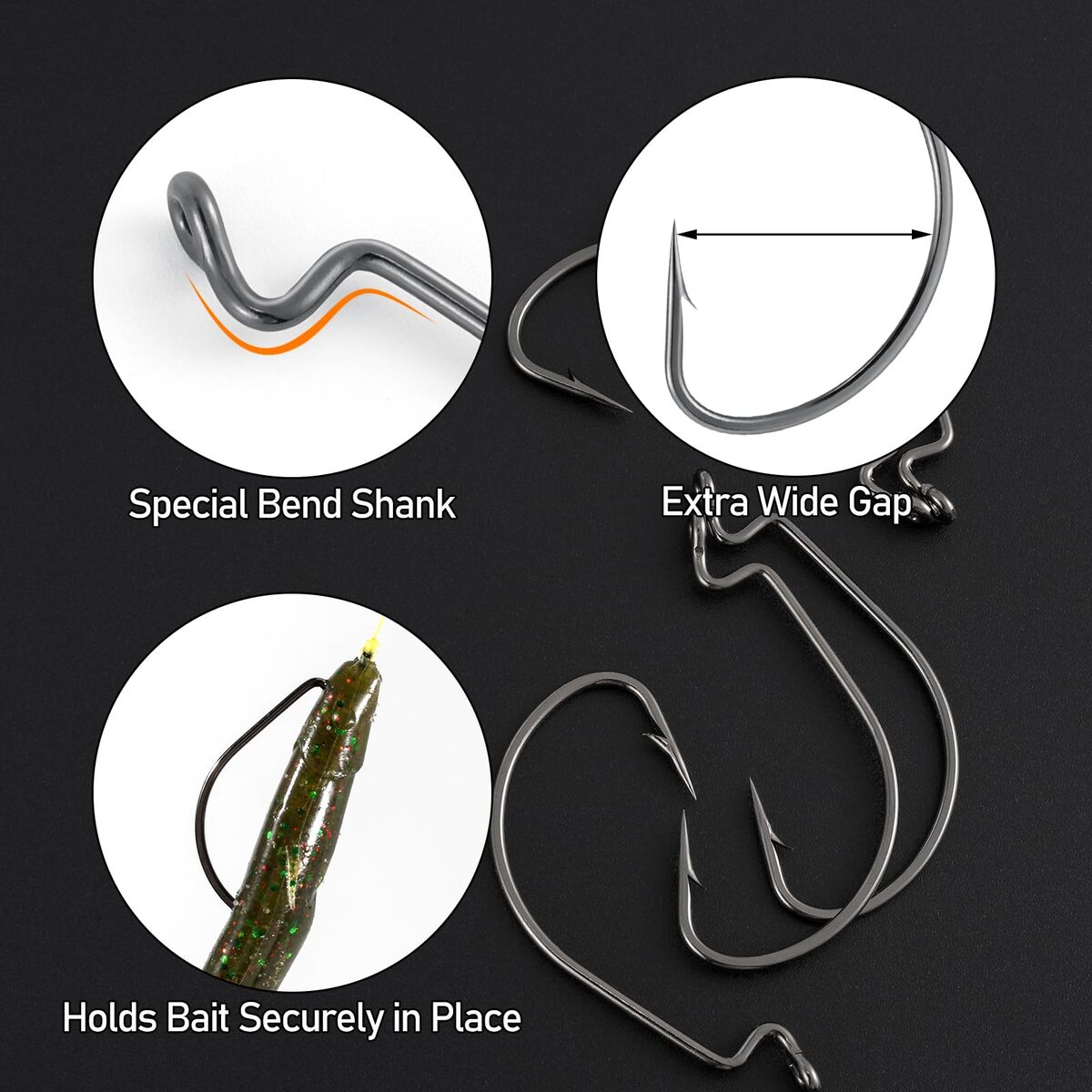 Extra Wide Gap Design: The extra-wide gap of these hooks provides a secure hold and allow for easy hook sets. The needle point is incredibly sharp, ensuring successful hookups.,Perfect for Any Soft Plastic Bait Application: With their special bend, these worm hooks can securely hold various types of soft plastic baits in place, making them versatile for different fishing techniques.,High Strength and Durability: High-carbon steel construction ensure superior strength and durability, provides these fishing hooks lighter weight, 20% higher strength. All over plated for corrosion resistance. Not only does this hook not bend in power situations, it stays sharp even after being dragged across rocks all day.,Wide Application: These worm hooks are suitable for various fishing rigs such as Texas Rig, Carolina Rig, No Sinker Rigs, Neko Rig, and more. They can be used in both freshwater and saltwater environments.,Pack of 100; Size 5/0