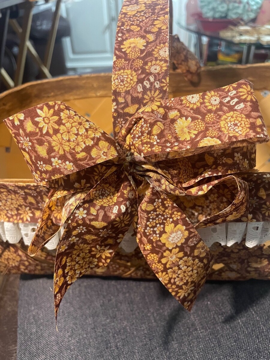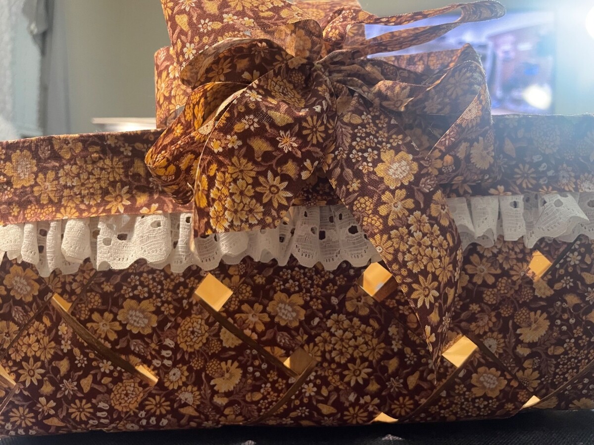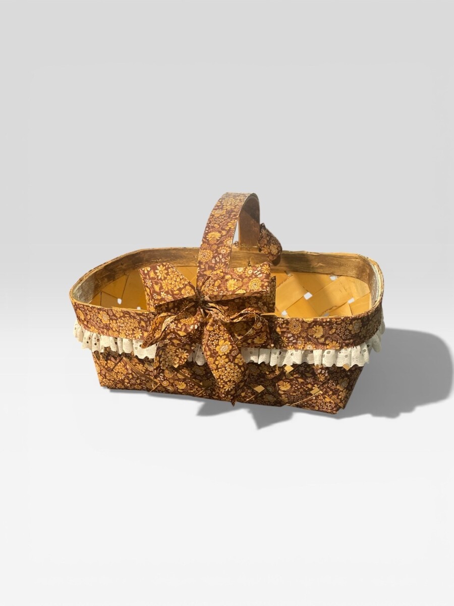 Vintage woven wood decorative basket featuring a brown floral fabric overlay with lace trim and bow accent. This charming piece has a rustic farmhouse and cottage-style aesthetic that works beautifully for seasonal styling, entryway displays, or country kitchen decor.