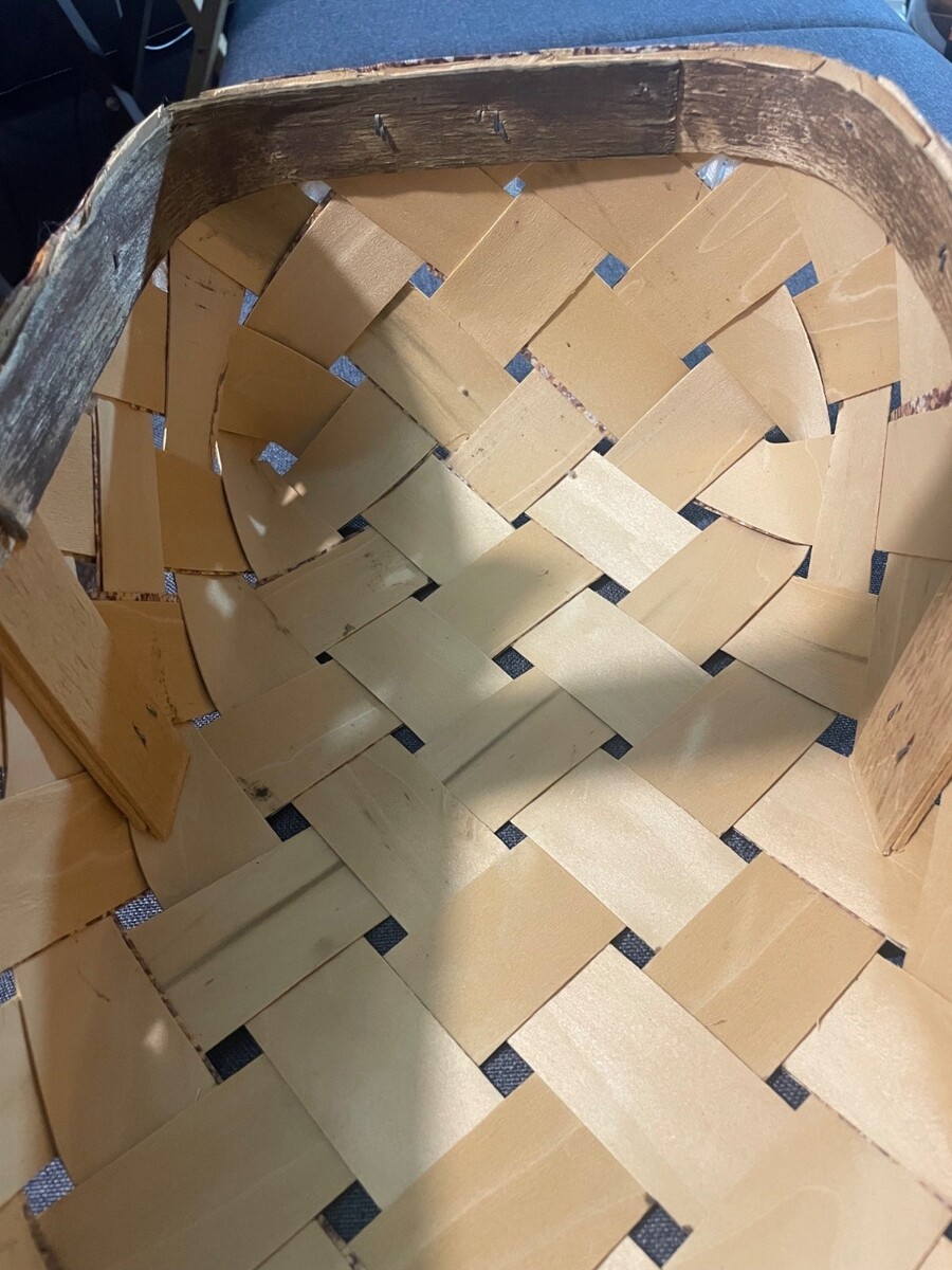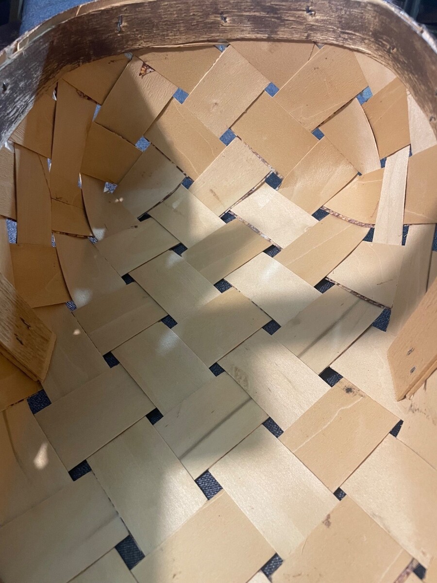 The basket is structurally solid with an intact woven interior. There is visible wear consistent with age and use, including scuffing and finish wear along the top wooden rim, minor surface wear on the handle, and small visible nail hardware on the side. The fabric overlay and bow remain attached with light fraying in areas. Please review all photos closely for full condition details.