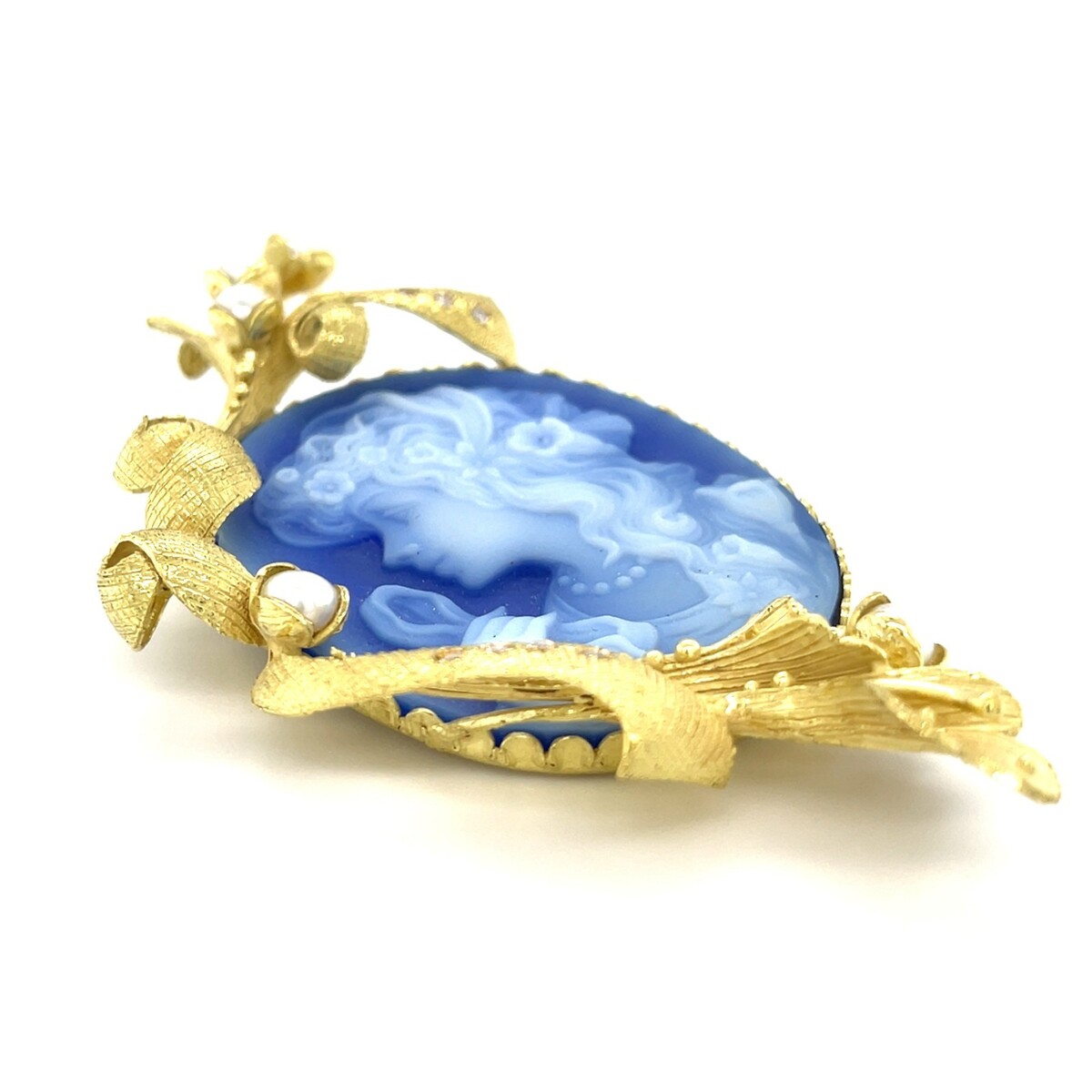 18k gelbgold geschnitztes Chalcedon Cameo mit Diamant und kultivierte Perleakzente
