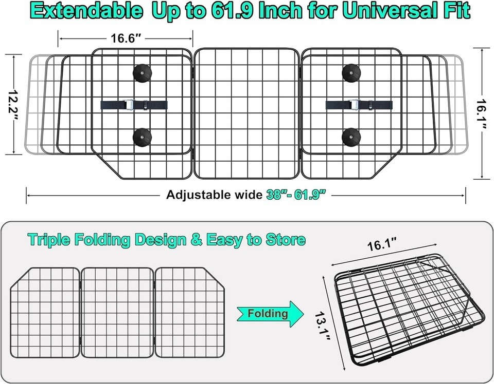 ?Universal Fit by Fully Extendable?The main panel measures size: 38in.(L) x 16.1in.(H), two side panels measures size: 16.6in.(L) x 12.2in.(H). This maximum extendable size of our dog fence with optimized structure is up to 61.9 in, large enough to cover cargo are, fit most SUVs, Vans, Truck,Jeeps and Hatchbacks.
