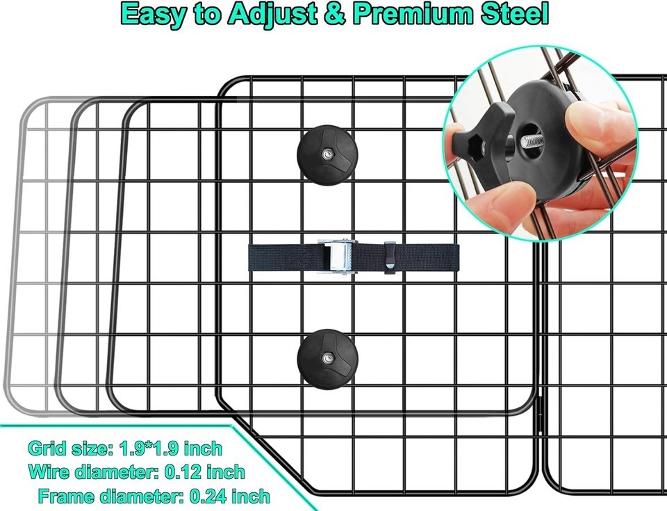 ?High Quality Steel Wire?This sturdy dog mesh barrier is made of premium-quality thickened steel wire, the welding strength of steel wire is sturdy enough even for aggressive dogs paw or bite it. Smooth steel surface spray coating will not scratch car seat covers, passengers or hurt your pet.This durable and rust-proof dog car barrier will provide a long-lasting use.