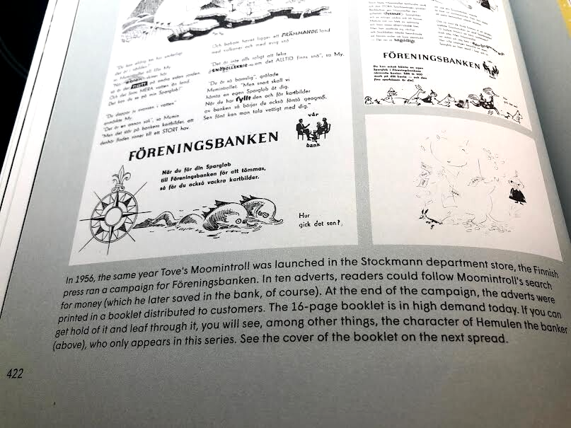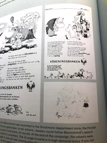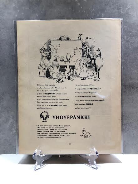 During the 1950's Tove Jansson's cartoon character Moomin (Moomintroll) was used to advertise Yhdyspankki (Union Bank of Finland). Tove illustrated the ADs by herself.
