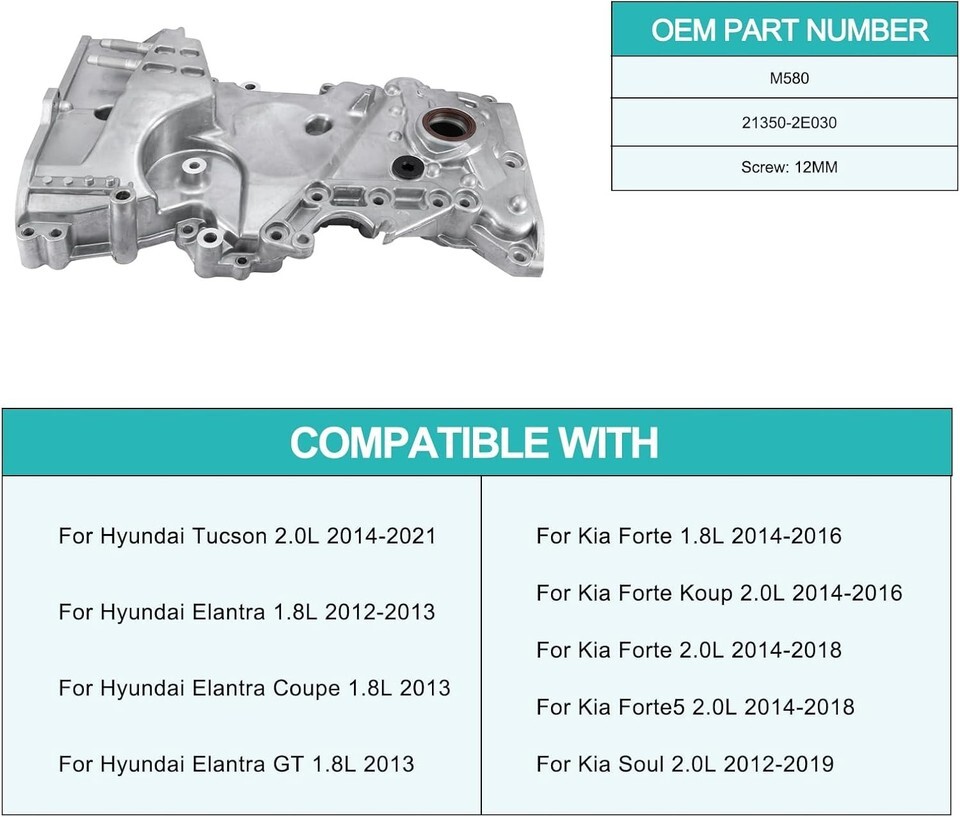?OEM PART NUMBER?M580 21350-2E030 (Screw: 12MM) ?FITMENT?Compatible with Hyundai Tucson 2.0L 2014-2021/Elantra 1.8L 2012-2013/Elantra Coupe 1.8L 2013/Elantra GT 1.8L 2013, For Kia Forte 1.8L 2014-2016/Forte Koup 2.0L 2014-2016/Forte 2.0L 2014-2018/Forte5 2.0L 2014-2018/Soul 2.0L 2012-2019 ?PREMIUM PERFORMANCE?Precision fitment to protect the timing chain and gears from debris. ?STRICT QUALITY CONTROL?Engineered and tested to match or exceed OE for Optimal cooling and lubrication. Manufactured in TS16949 certified facilities, 100% function and leakage tested. ?WARRANTY?1 Year.