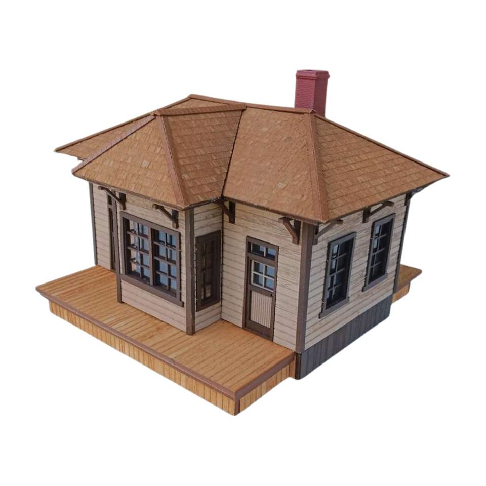 This compact depot captures the charm of early 20th-century American railroading. Featuring clapboard siding, a wood plank platform, detailed windows, and a hipped shingle roof with decorative brackets, it reflects the small-town stations that once served as community hubs. Versatile in design, it fits eras from the steam age through early diesel, making it ideal as either a passenger stop or a mixed-use station on any layout.