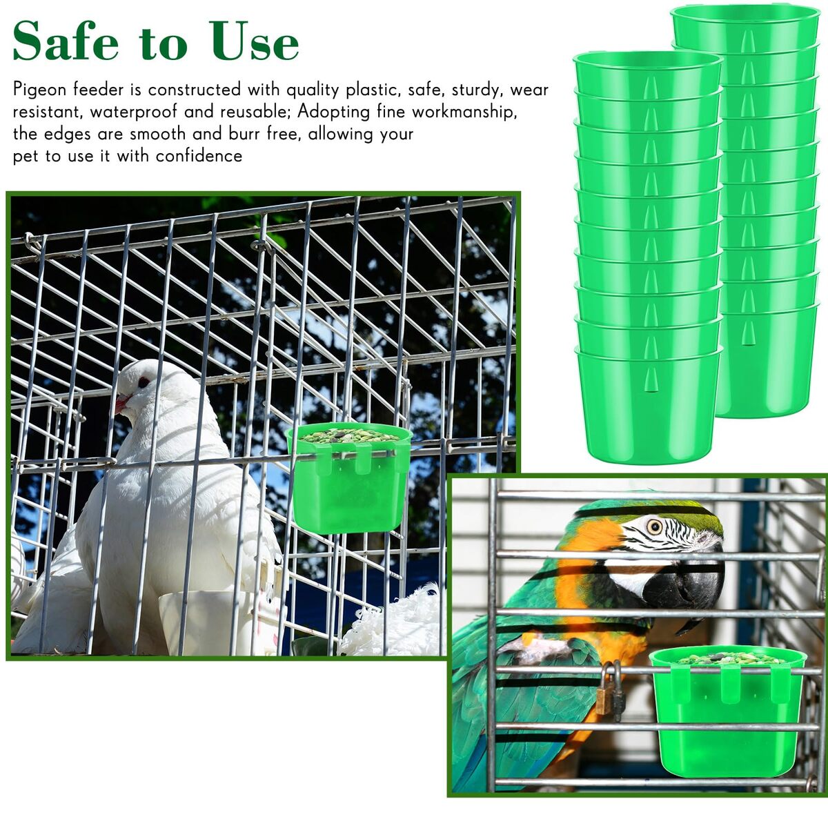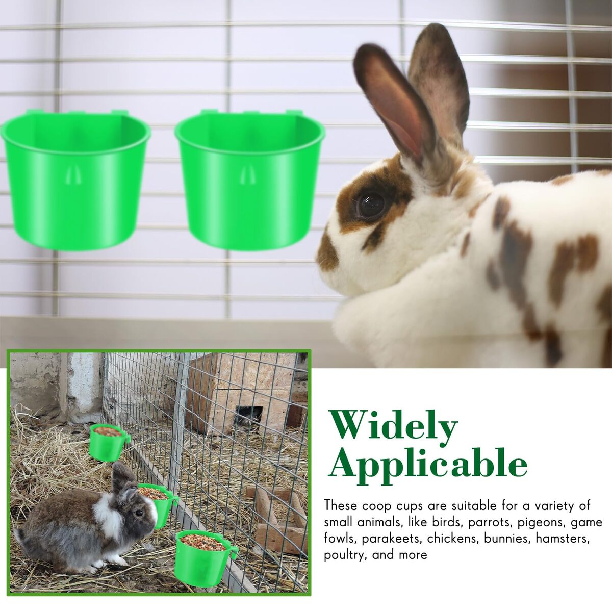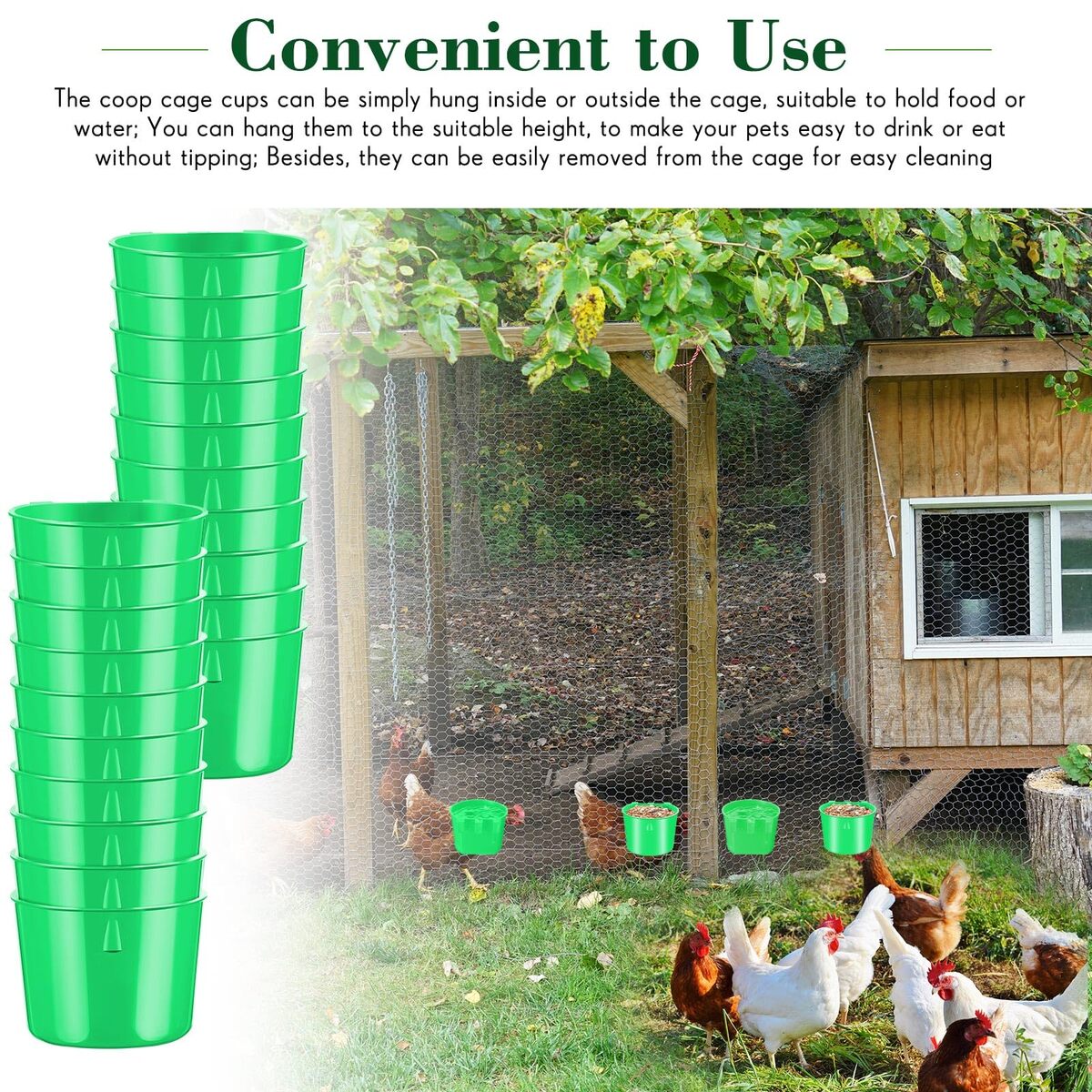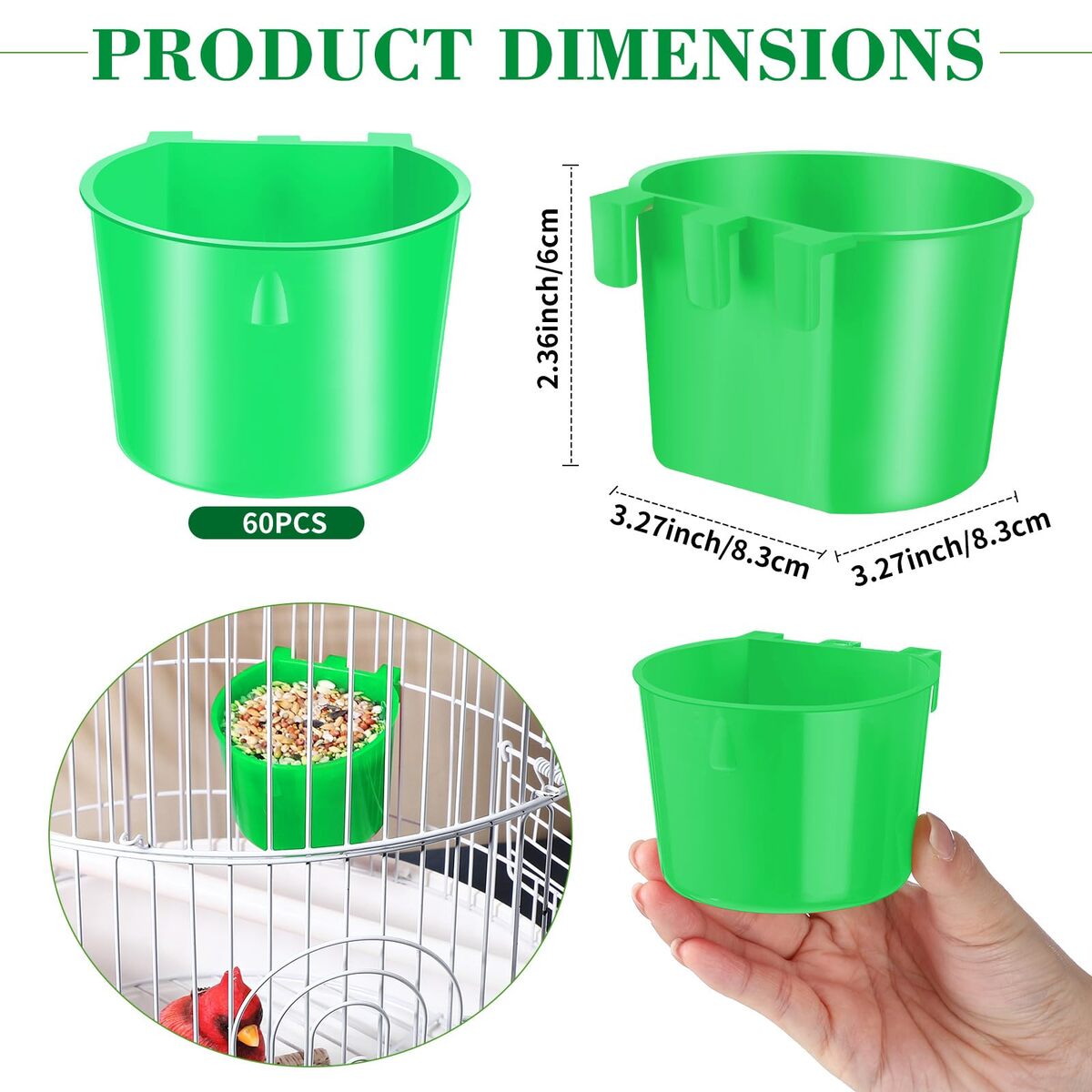 Sufficient Quantity: there are 60 pieces of cage cups in green, with the size of 3.27 inch/ 8.3 cm in length, 3.27 inch/ 8.3 cm in width, 2.36 inch/ 6 cm in depth, proper size and ample quantity can meet your pet's using and replacement needs,Simple to Hang: the chicken feeding cup is equipped with a hook on the back, which can be easily attached to wire cages, convenient for small pets to eat and drink; In addition, it is easy to wash with water, bringing you more convenience,Convenient to Use: the birds cage cups can be simply hung inside or outside the cage, suitable to hold food or water; You can easily take out and fill food or water, and you can hang them to the suitable height, to make your pets easy to drink or eat without tipping; Besides, they can be easily removed from the cage for easy cleaning,Reliable Material: the poultry feeder is made of quality plastic, which is sturdy and reliable, not easy to break or deform, can be applied for a long time,Widely Applicable: these coop cups are suitable for a variety of small animals, like birds, parrots, pigeons, game fowls, parakeets, chickens, bunnies, hamsters, poultry, and more