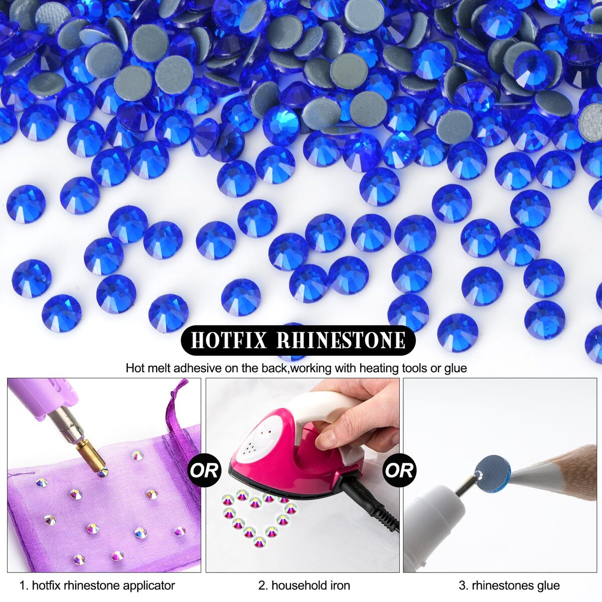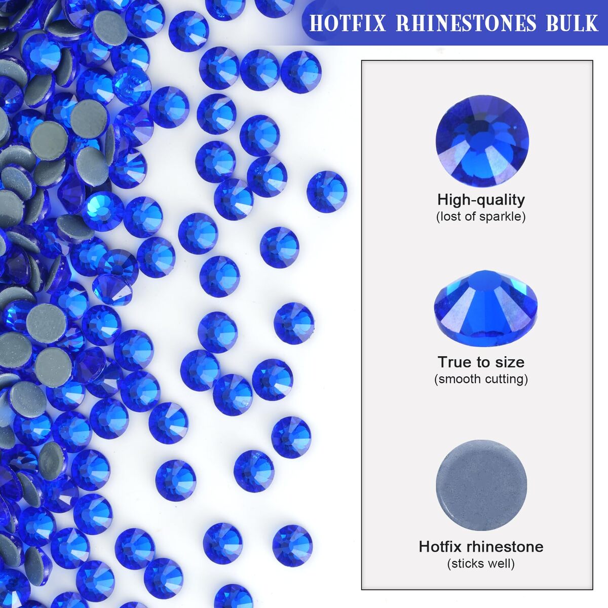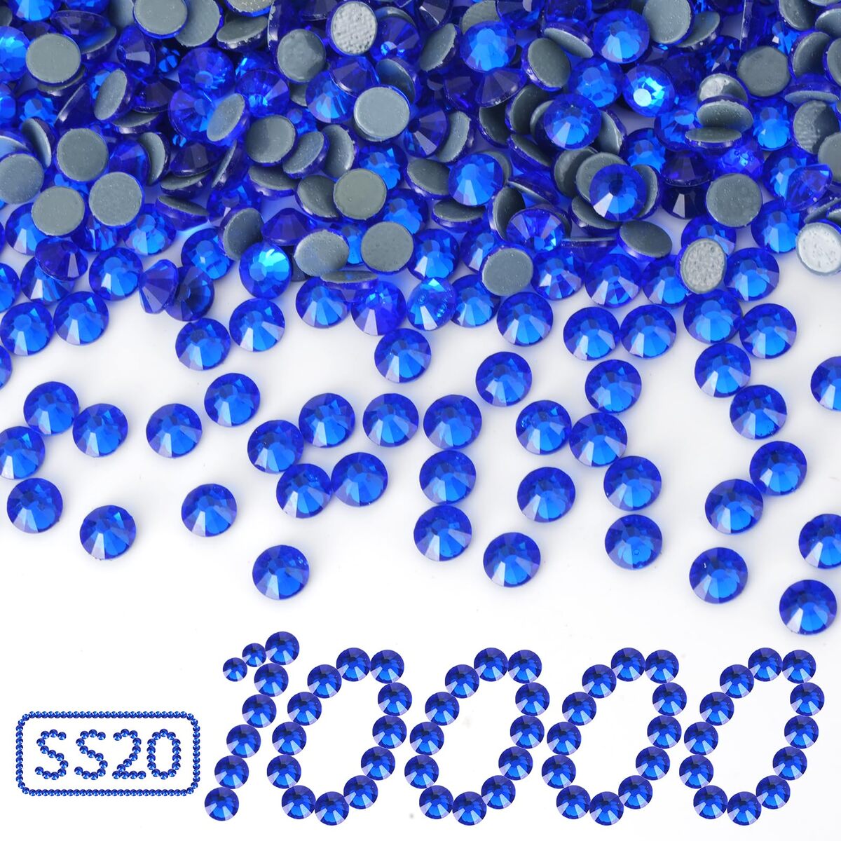 Hotfix Rhinestones Bulk: 10000 pieces hot fix royal blue rhinestones per pack, SS20, Size 4.6-4.8mm.,Hotfix Rhinestones for Crafts: You use hotfix rhinestones on materials such as paper, card, wool, cotton, linen, viscose, tulle, denim, lycra, cotton jersey, silk, and synthetic fabrics (polyester, etc.). Hotfix rhinestones are perfect for clothing, shoes, dresses, hats, hairbands, belts, scrapbooks, and other DIY decorations.,High-Quality Glass Hot Fix Rhinestones: These hotfix crystal rhinestones are crafted from top-quality glass with perfect cutting that provides intense sparkle and refraction, making rhinestones shine like a diamond.,Easy To Use: These hot-fix rhinestones have a heat-activated adhesive already applied to the back side of the crystal, they can be applied with heat either from a hotfix applicator or an iron with the steam turned off. Applied with the additional glue instead of heating also works.,Customer Service: All your orders will fulfilled by the Amazon service team. If you have any questions about your order, please let us know. We are always here to help you and will do our best to ensure you have a pleasant experience.