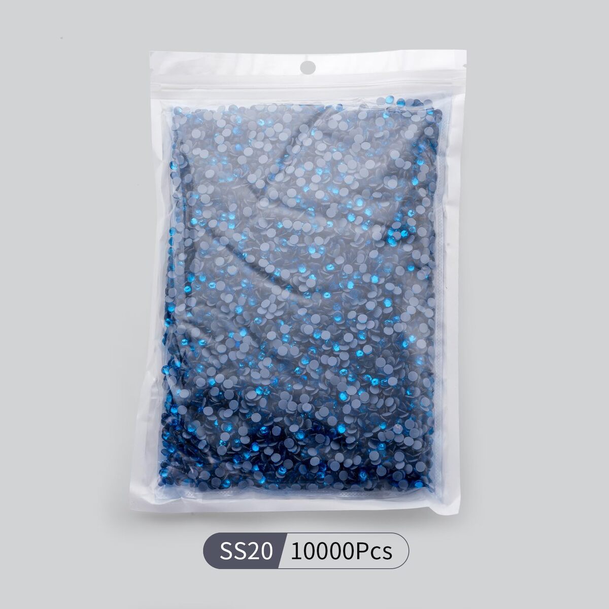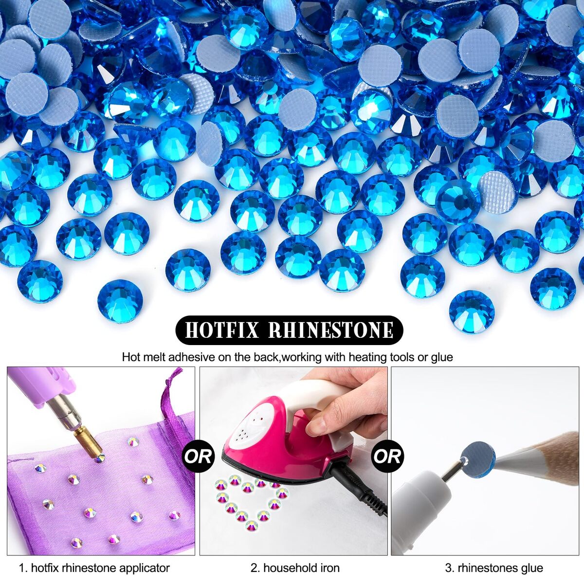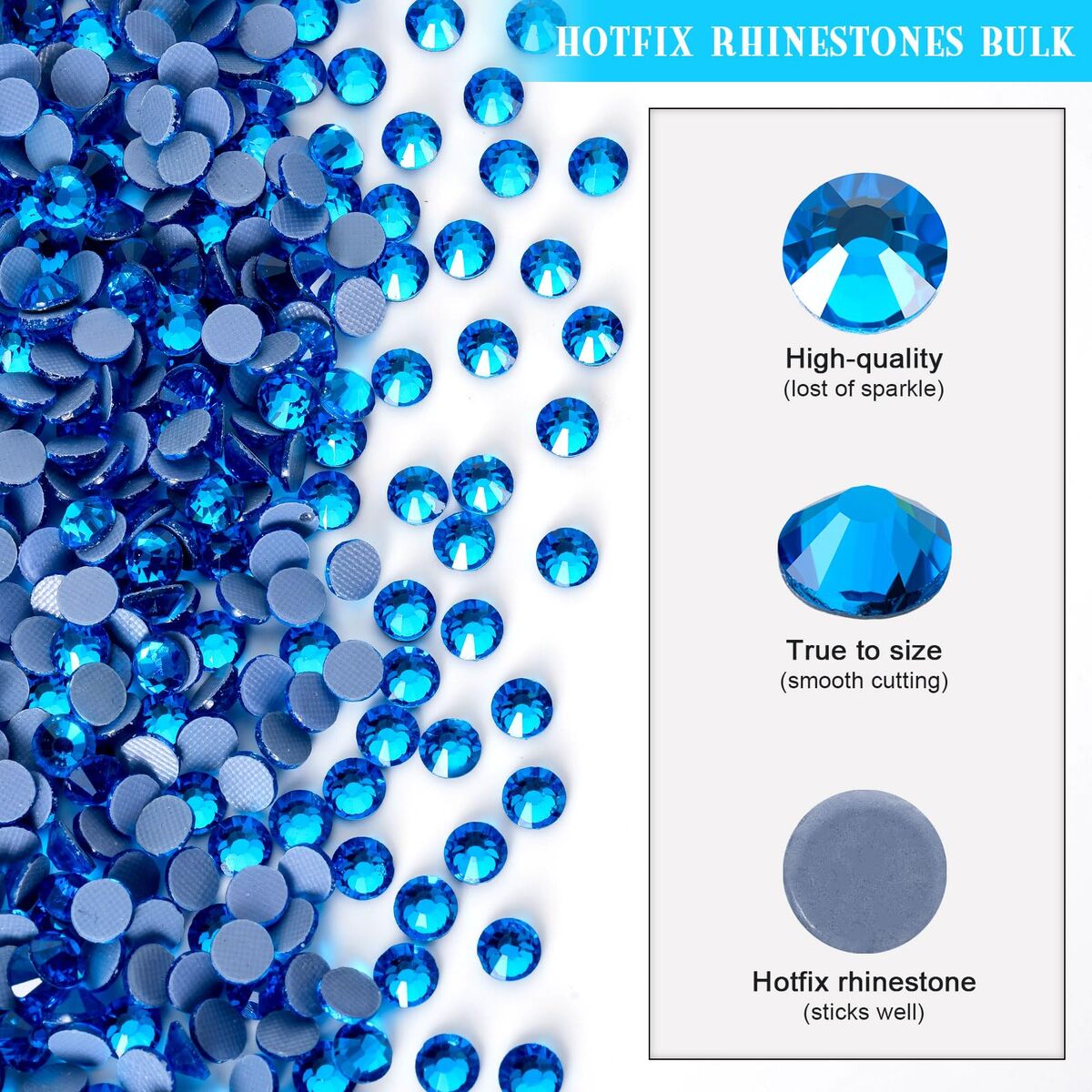 Hotfix Rhinestones Bulk: 10000 pieces hot fix capri blue rhinestones per pack, SS20, Size 4.6-4.8mm.,Hotfix Rhinestones for Crafts: You use hotfix rhinestones on materials such as paper, card, wool, cotton, linen, viscose, tulle, denim, lycra, cotton jersey, silk, and synthetic fabrics (polyester, etc.). Hotfix rhinestones are perfect for clothing, shoes, dresses, hats, hairbands, belts, scrapbooks, and other DIY decorations.,High-Quality Glass Hot Fix Rhinestones: These hotfix crystal rhinestones are crafted from top-quality glass with perfect cutting that provides intense sparkle and refraction, making rhinestones shine like a diamond.,Easy To Use: These hot-fix rhinestones have a heat-activated adhesive already applied to the back side of the crystal, they can be applied with heat either from a hotfix applicator or an iron with the steam turned off. Applied with the additional glue instead of heating also works.