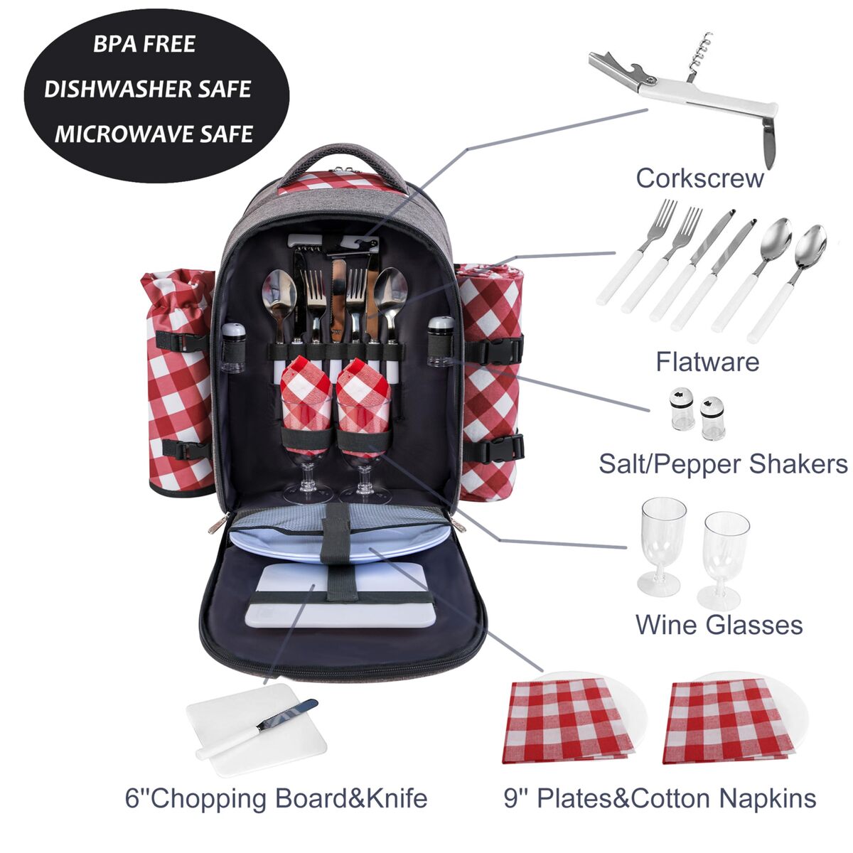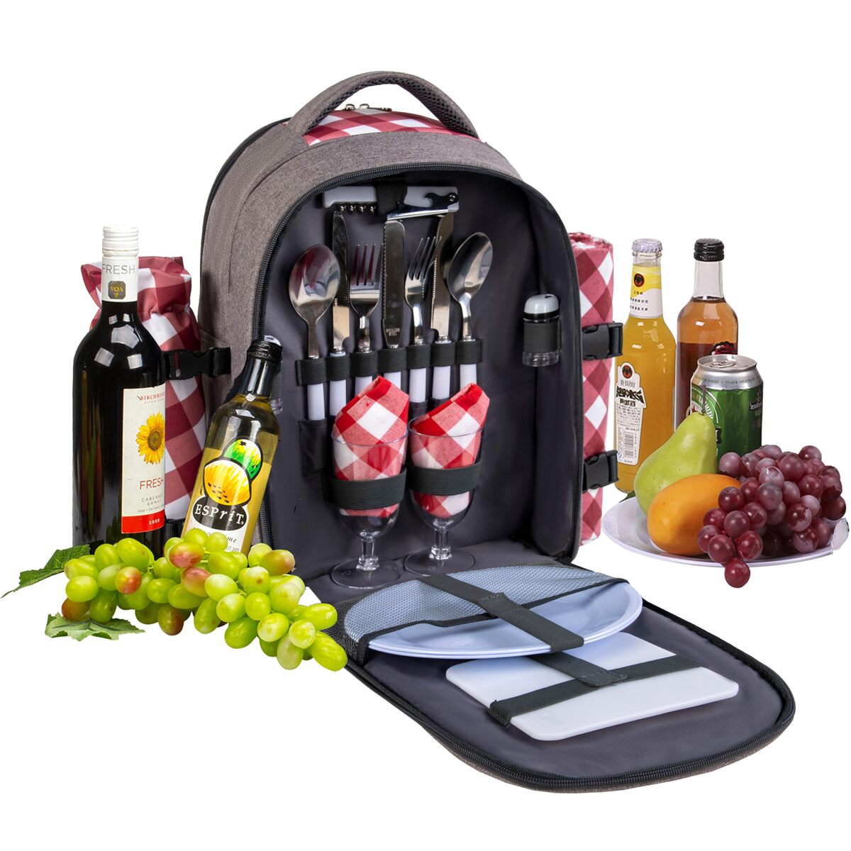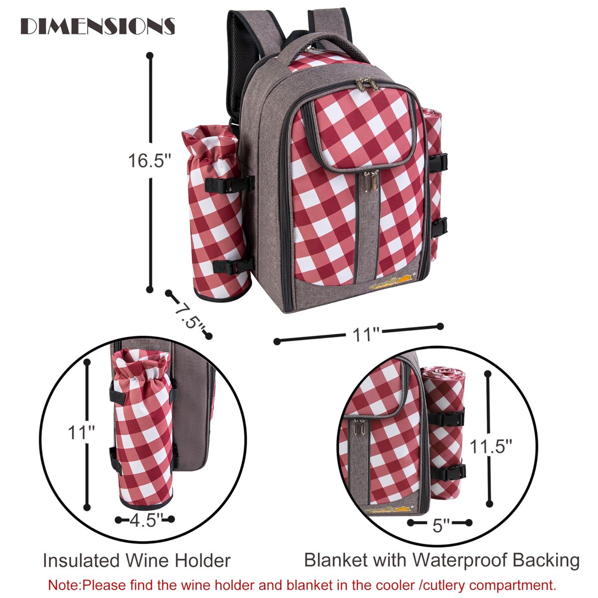 Premium quality all-in-one picnic backpack with comfortable padded straps for extra comfort and multiple storage compartments for your convenience.,Includes:2stainless steel knives, forks, spoons, dinner plates, cotton napkins, wine glasses 1cheese/butter knife 1bottle opener 2salt/pepper shakers 1plastic chopping board + waterproof back fleece picnic blanket (size 45x53 inch),Picnic food storage compartment is 15% bigger than competitors with premium insulation lining for foods to stay warm or cooler longer. A detachable insulated bottle/wine cooler to carry a large bottle of wine/water securely,along with a large 45x53 inches waterproof backing fleece picnic blanket.,Features soft padded shoulder straps for comfort and a top-mounted carrying handle.Size:16.5" high x 13.7" wide x 7" deep.The bag contains a cold storage compartment to store your picnic foods in such as sandwiches, cold meats and cakes this will keep your food fresh and cool for a long time