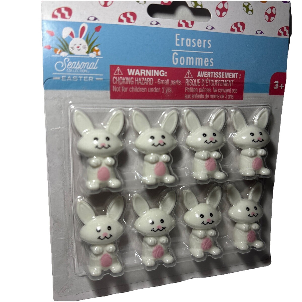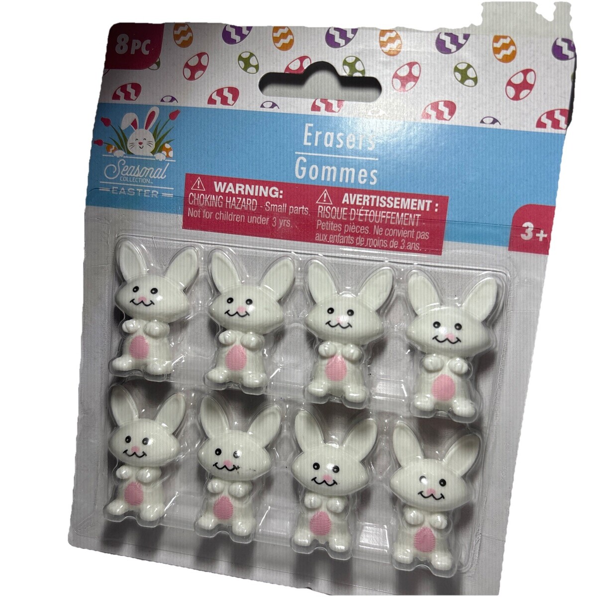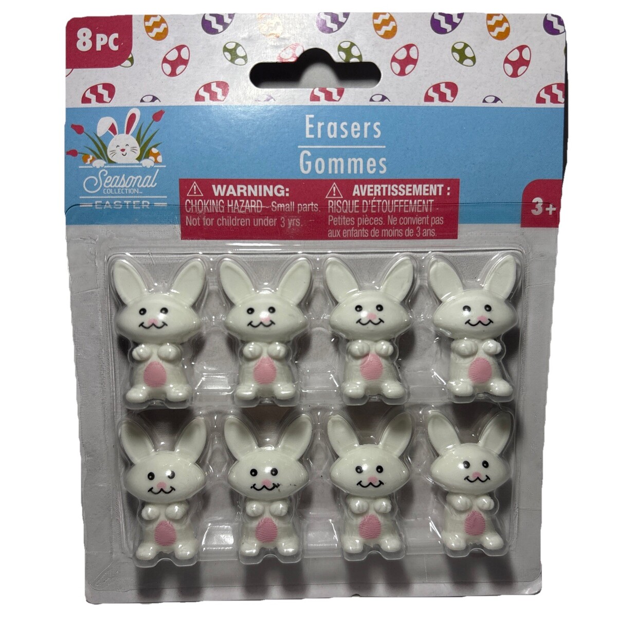 The product is a set of 8 small rabbit/bunny themed erasers designed for kids ages 3+ to celebrate the Easter season. The brand is the Seasonal Collection, and the erasers are white in color with an Easter theme. They are themed for children and suitable for both boys and girls. Perfect for school supplies or home use, these cute and colorful erasers are sure to bring joy and fun to young students or craft enthusiasts.