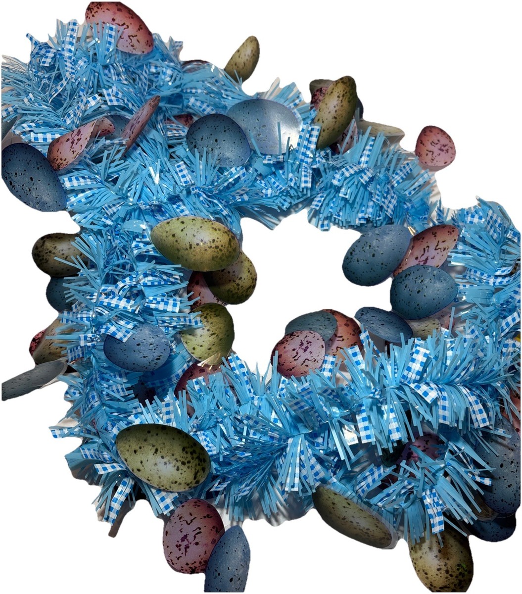 Happy Easter NEW Blue And White Checkered Garland With Artificial Eggs, 9ft Long