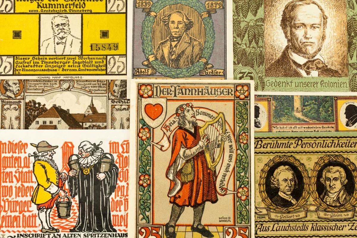 This lot will include 25 individual notgeld notes from Germany after World War I. All will be in Extra Fine to Uncirculated (XF-UNC) condition. Face values between 5 pfennig to 5 mark. Famous people theme.