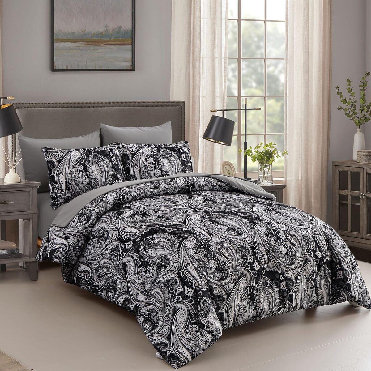DJY Black Paisley Comforter Set Queen Size 7 Piece Bed in a Bag Black Gray Boho
