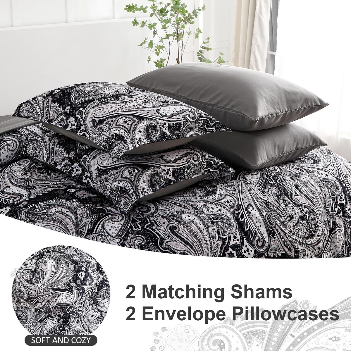 Paisley Comforter Set: Black boho paisley comforter design is taken inspiration from vintage classic paisley patterns, matched with a touch of vibrant color, giving it a vintage yet stylish look, making the comforter a good artistic home bedding decoration.,Soft and Comfortable: You will like the black comforter set that has an ultra soft feel. A side is classic paisley pattern and B side is elegant grey. 7 piece paisley comforter set queen includes 1 comforter(90?x90?), 1 flat sheet(90?x102?), 1 fitted sheet(60?x80?+14?), 2 pillow shams(20?x26?), 2 pillowcases(20?x30?).,Exquisite Workmanship: The combination of black white and grey colors makes this comforter fashionable and timeless, beautiful prints give the western comforter stylish and luxurious atmosphere. 7 piece bed in a bag complete your bedding uses. It keeps you cozy during spring and summer months and warm during cold winter months.,High Quality Fabric: Both sides of the comforter are made from premium soft microfiber, more breathable and durable. The optimum thickness provides it with a balance of warmth and weight, so the bedding a perfect choice for all seasons.,Delicate Quilting: Textured with neat stitching, making the black comforter set look elegant, and would be pleasant to touch. The comforter set will not tear easily, fade or pill, saving you lots of time. Machine washable in cold water, tumble dry on low heat, do not bleach.