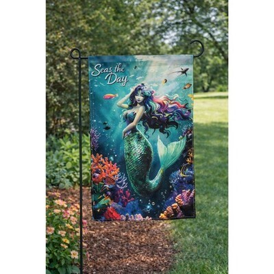 Bring the magic of the ocean to your garden with this beautiful Seas the Day mermaid flag. Featuring a mesmerizing underwater scene, this 12 x 18-inch flag showcases a multicolored mermaid with flowing hair, surrounded by sea creatures, coral, and bubbles. Pole not included.
