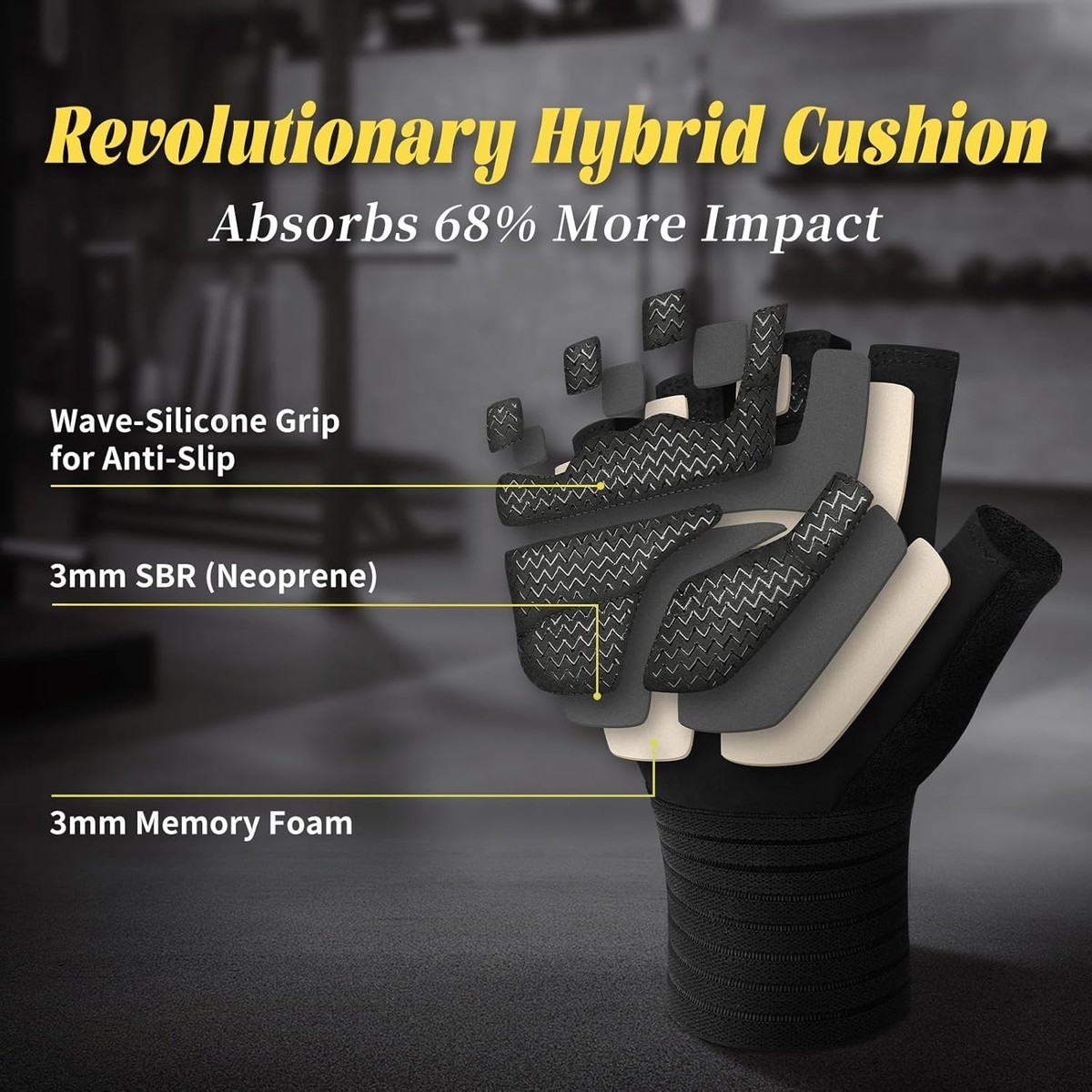 Pro-Shock Absorption Tech: Unique memory foam and SBR hybrid 6mm cushion offers flexibility and durability, absorbing 68% more impact than standard workout gloves while smartly distributing pressure throughout your palm.