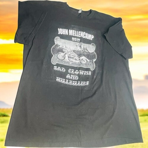 This John Mellencamp t-shirt from his 2017 Sad Clowns and Hillbillies tour is a must-have for any fan of the musician. The shirt features a graphic print of a clown and a hillbilly, with the tour name and dates on the back. It is made of comfortable cotton material and is machine washable for easy care.