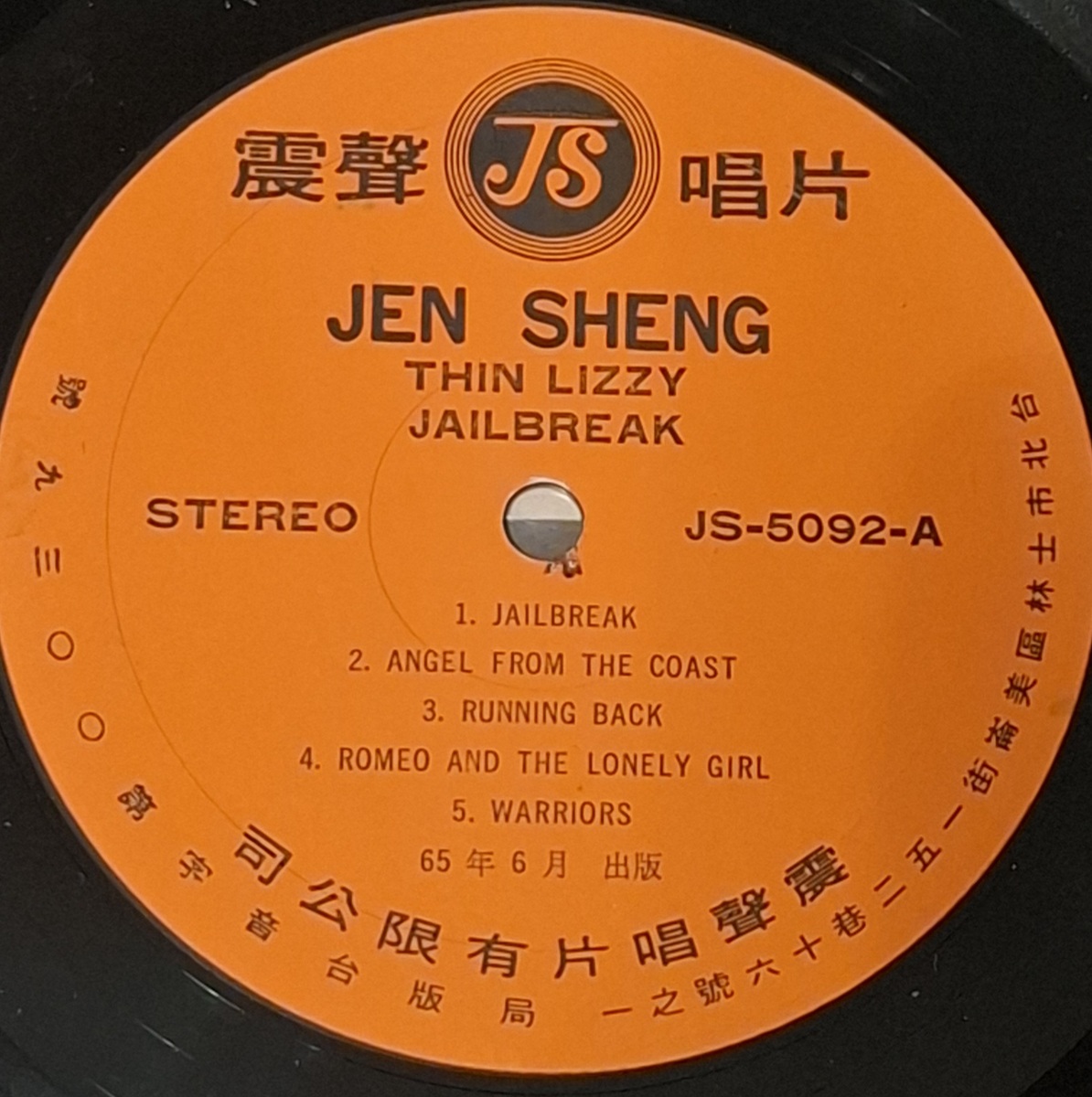 Vintage Taiwan pressing of Jailbreak by Thin Lizzy on Jen Sheng Records.