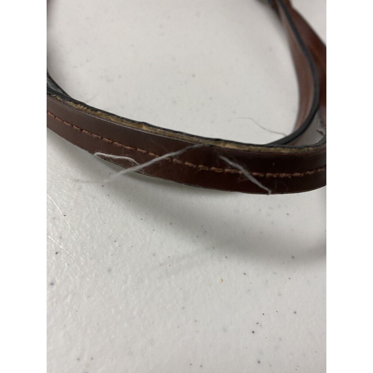 in used condition, no major flaws, one light stain on back as shown. And the leather Handles are worn. Measures 12" wide, 9"tall, and 4" deep.