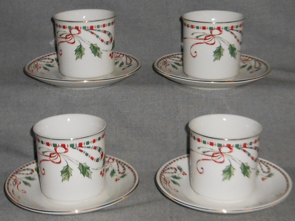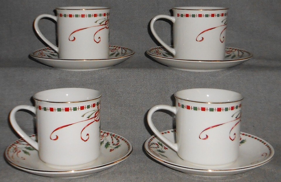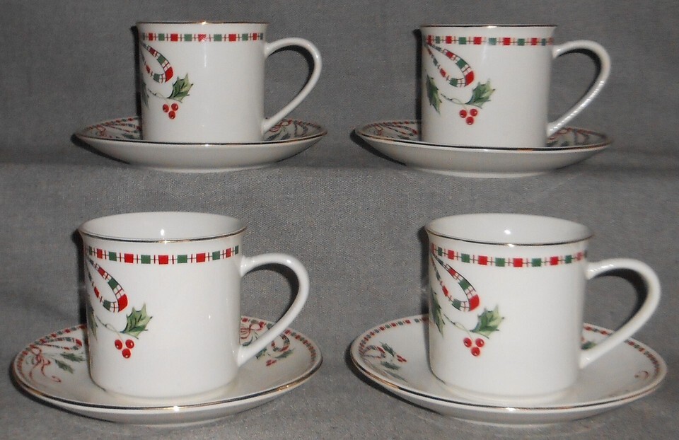 Set (4) Home Essentials TARTAN RIBBON PATTERN Cups and Saucers HOLIDAY CHRISTMAS