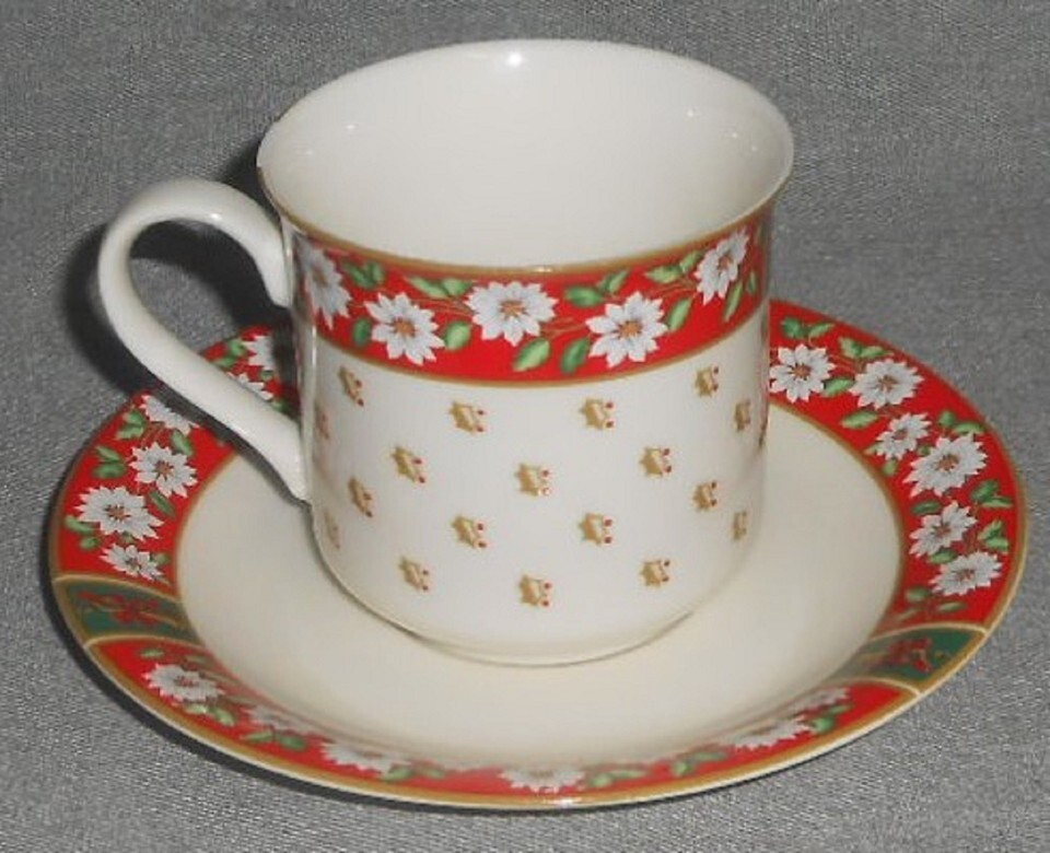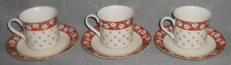 This is a Set of (3) 6 1/4" Saucers and (3) 3" Tall Cups from Kobe in the Christmas Holiday Charlton Hall Pattern - Made in Japan. They are all in great pre-owned near mint condition with no flaws or damage and all of gold trim and color is vibrant and intact with no wear.