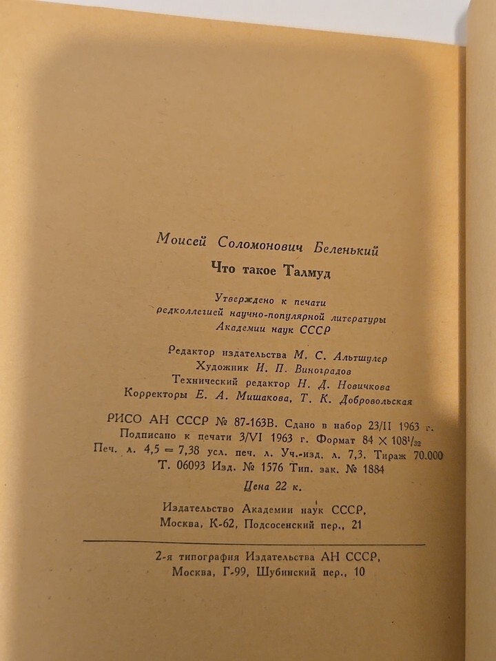 The product is a rare Soviet-era book titled "??? ????? ??????" by author M.S. Belenky, printed in 1963 in the USSR. This book is written in Russian and features a softcover binding. It offers a unique perspective on the Talmud, likely exploring its historical significance and cultural impact in Russian society during that time period. A valuable addition to any collection of antique and collectible books, this item provides insight into the literary and intellectual landscape of the Soviet Union in the mid-20th century.