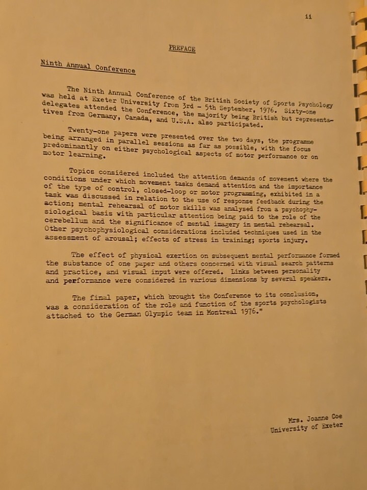 Rare - British Proceedings Of Sports Psychology IXth BSSP Congress 1976 Exeter